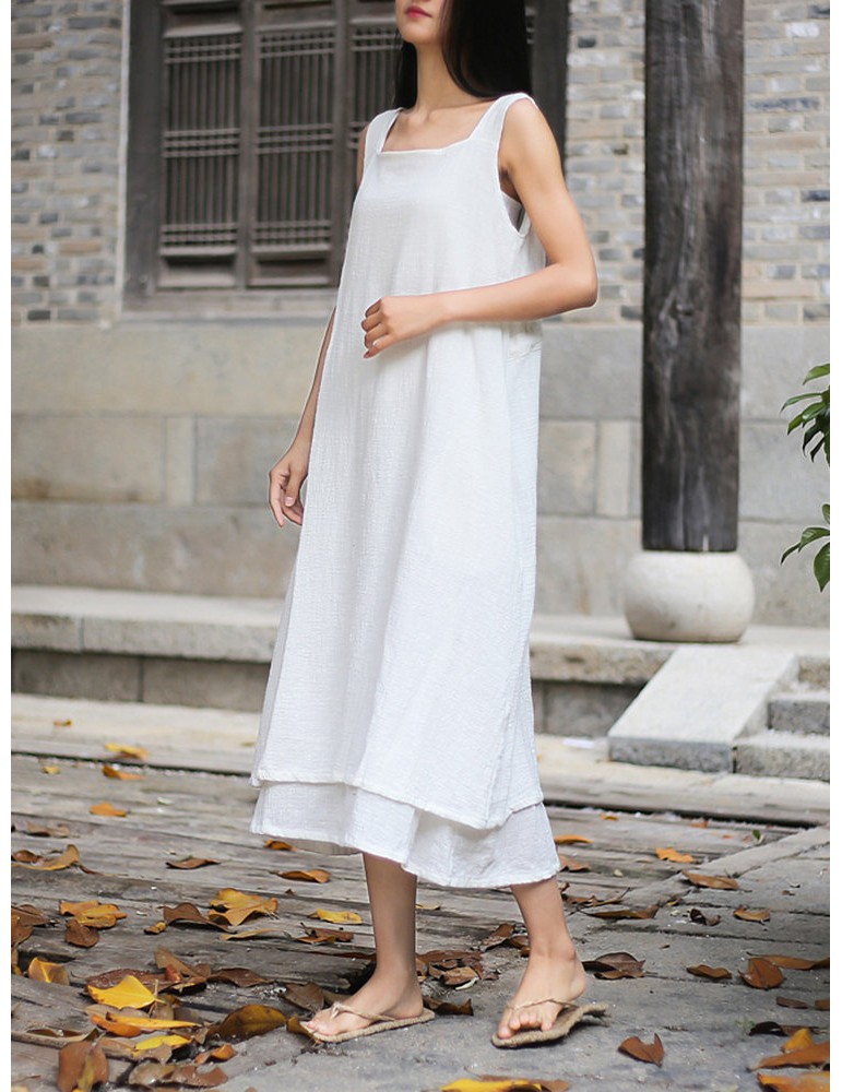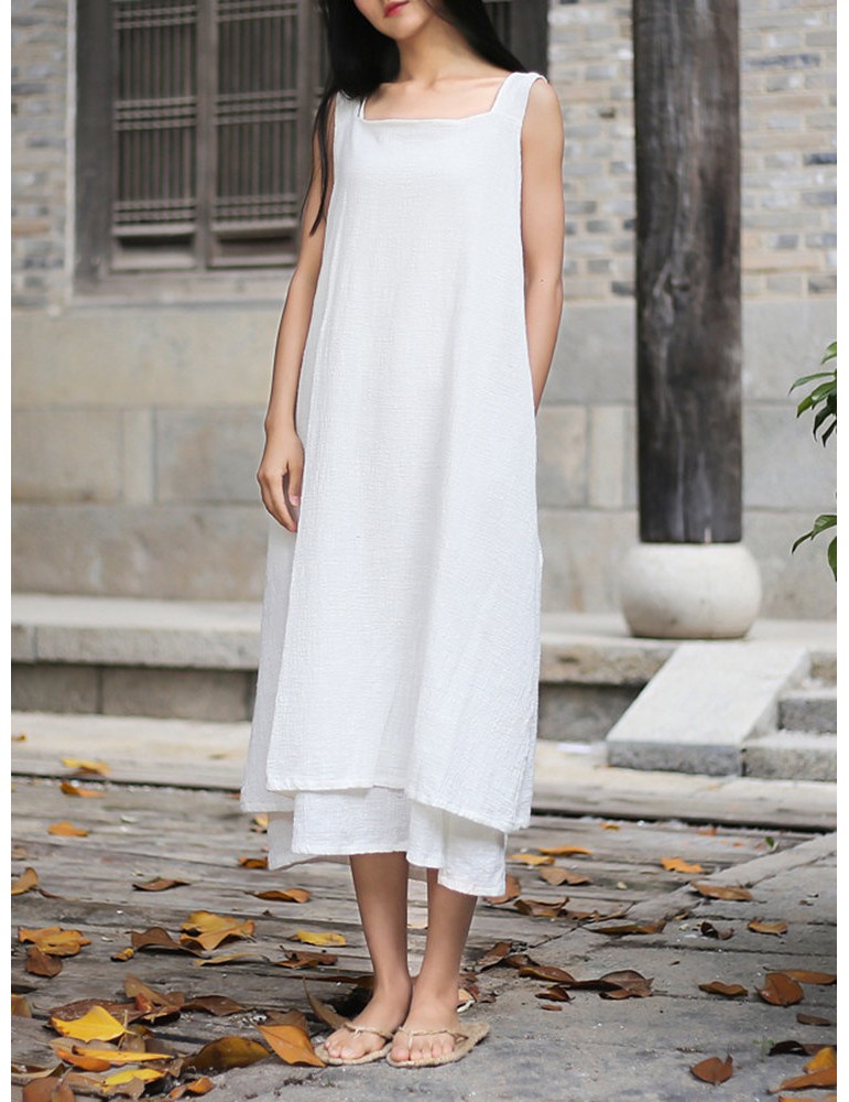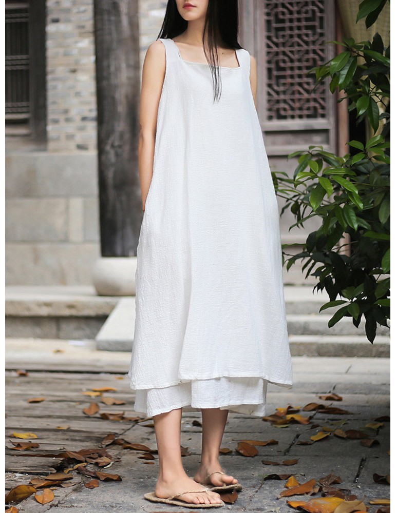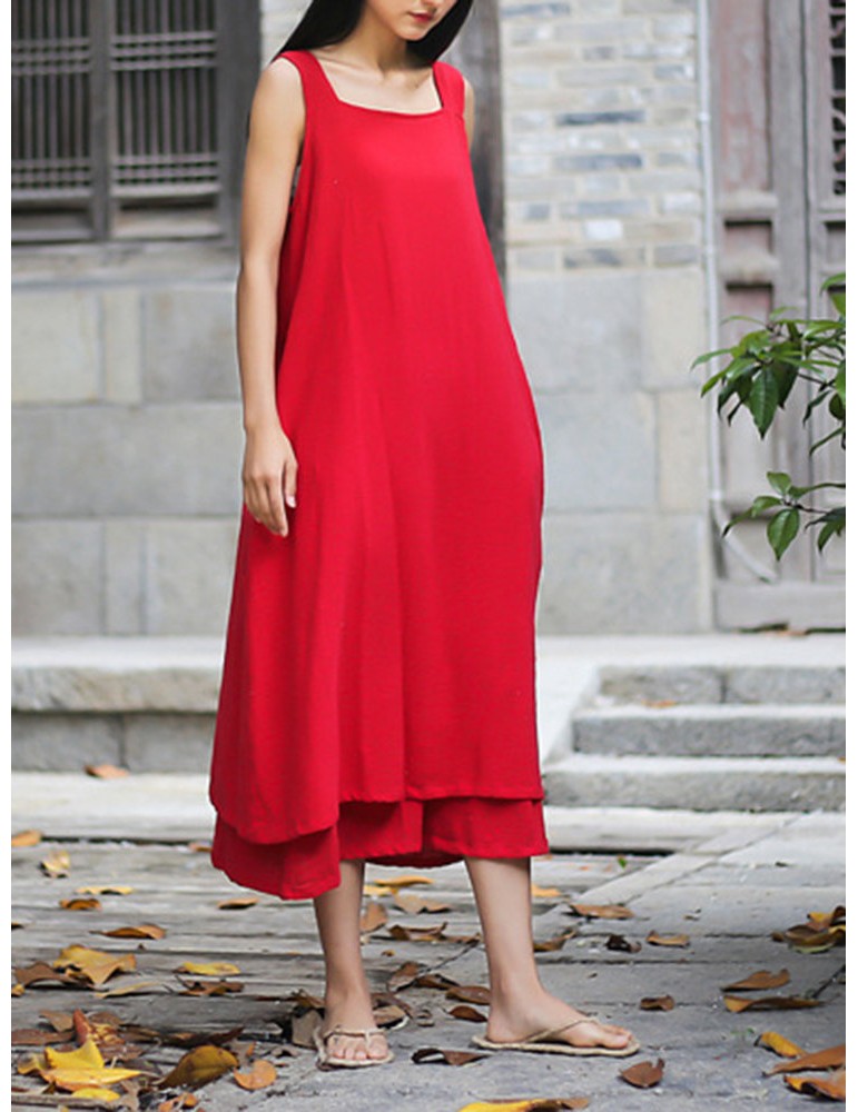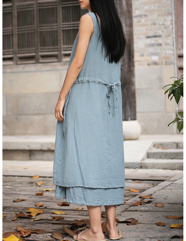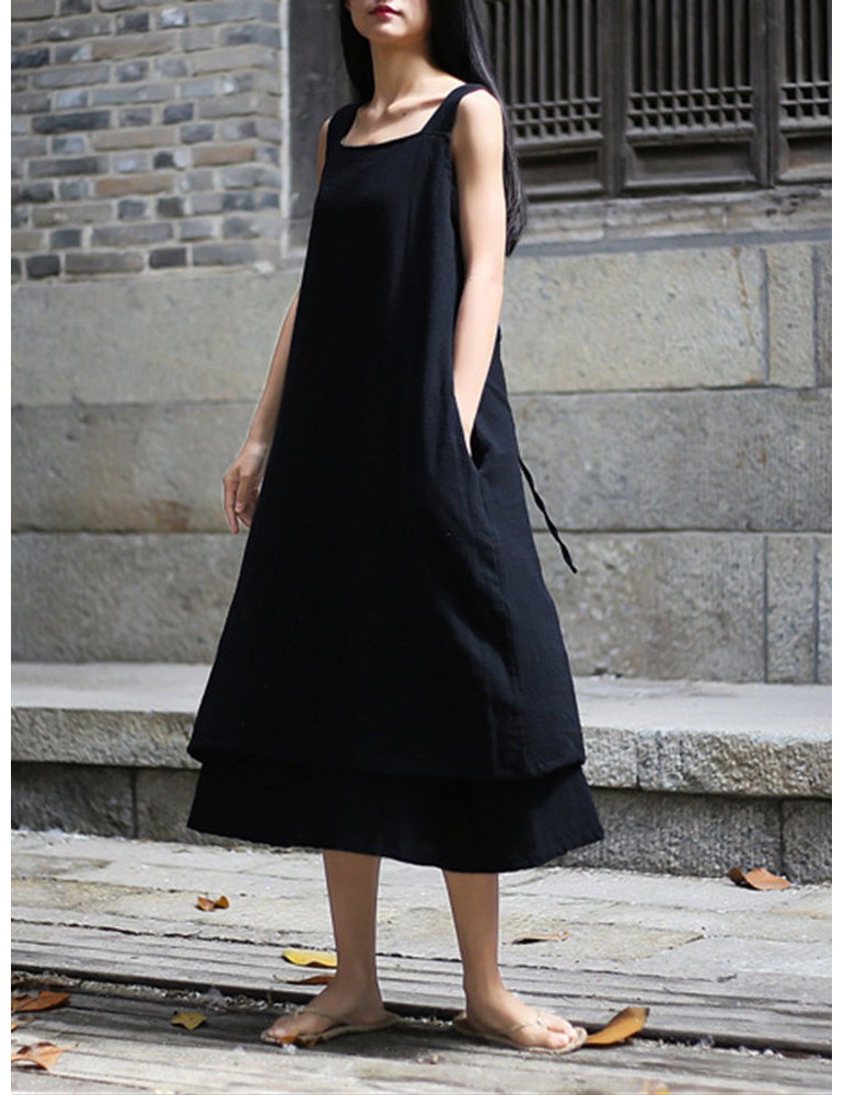 Sleeveless Pure Color Drawstring Layered Vintage Dresses