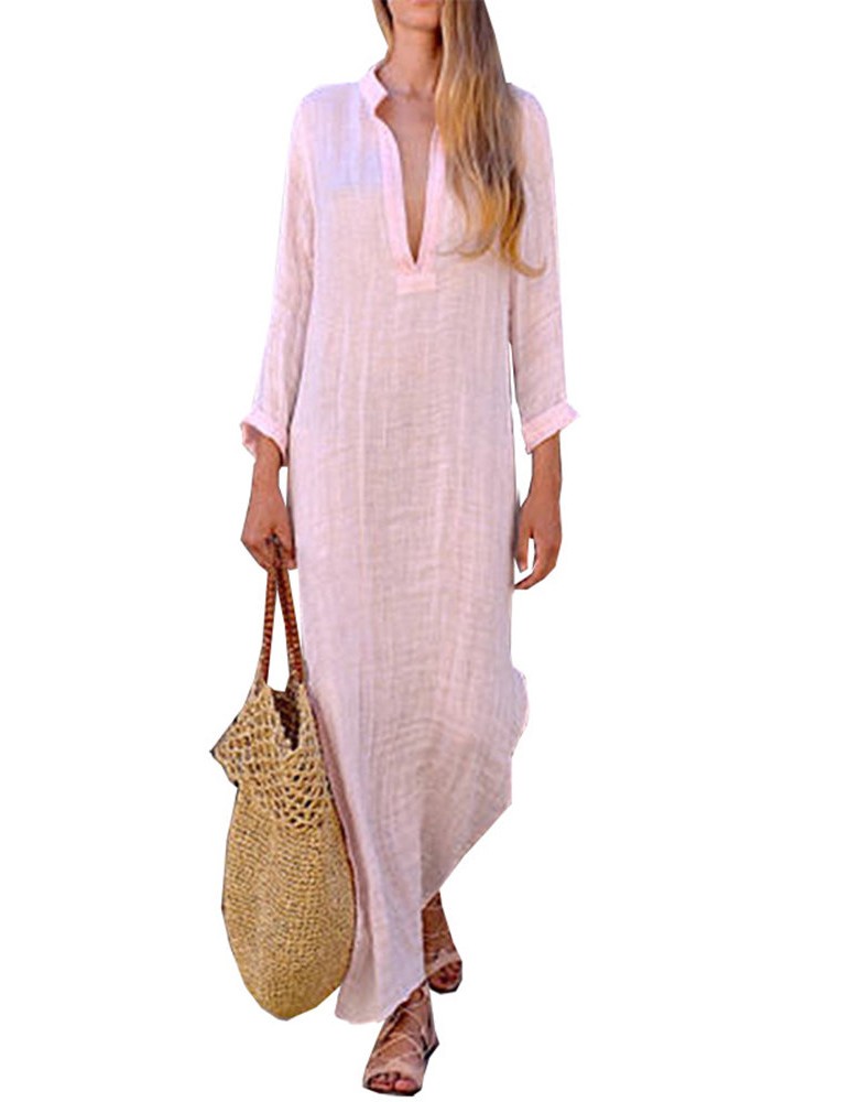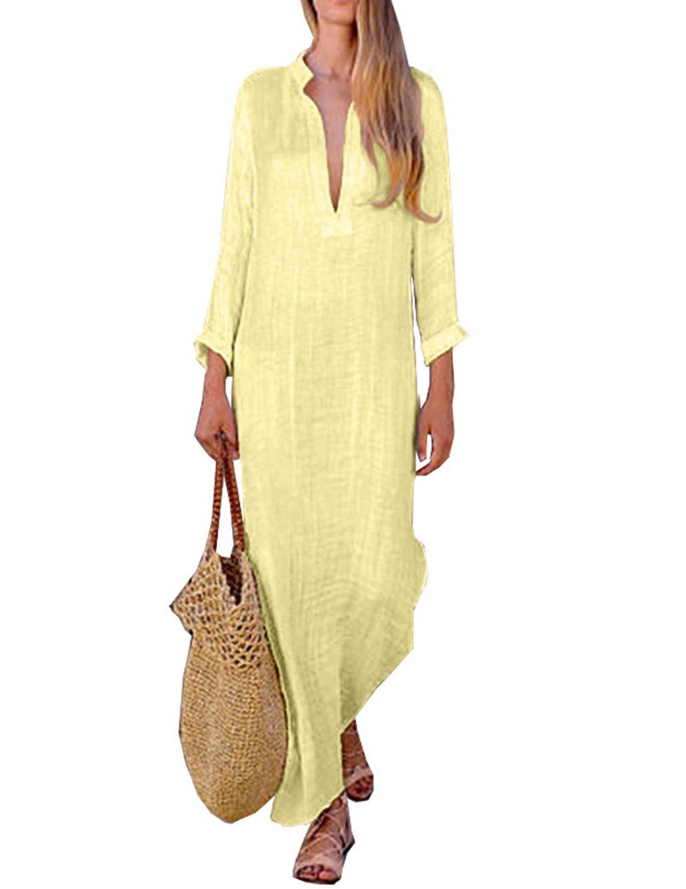 Deep V-neck Solid Color Cotton Maxi Casual Dresses