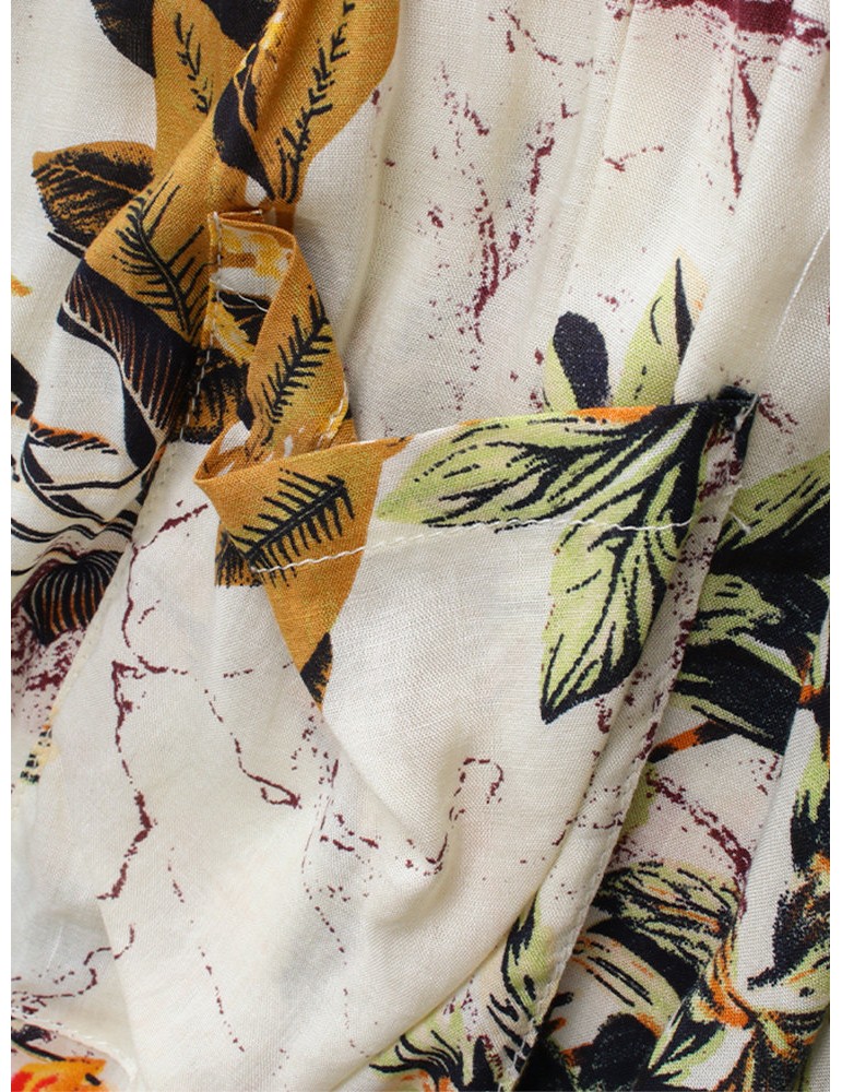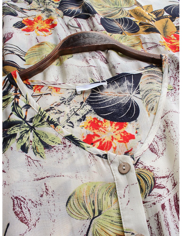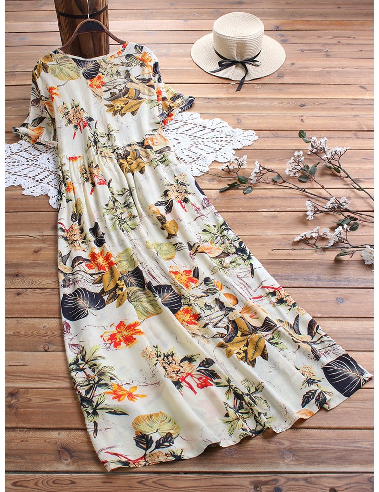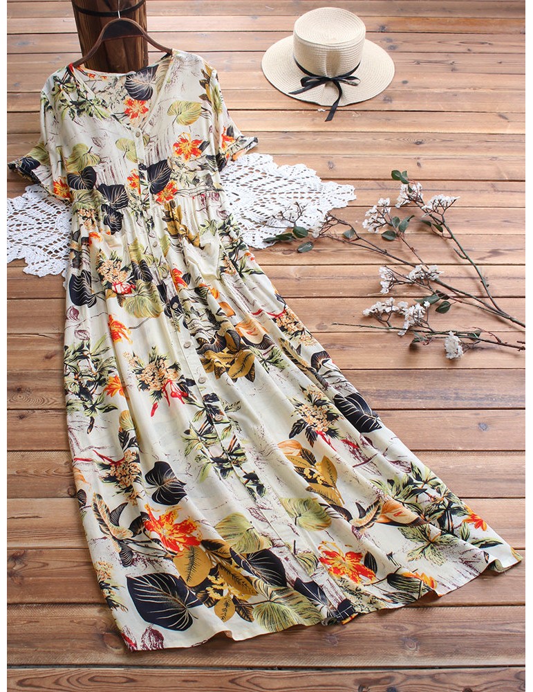 Leaves Floral Print Button Short Sleeve Vintage Dress