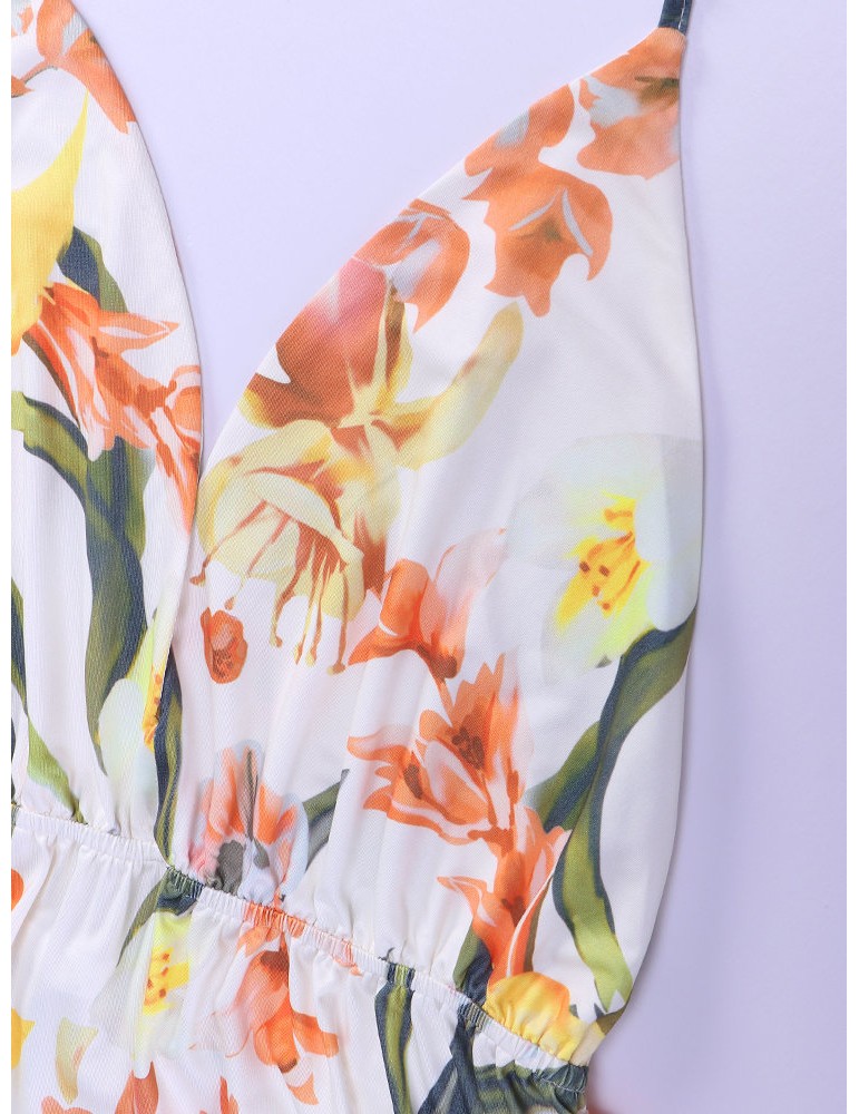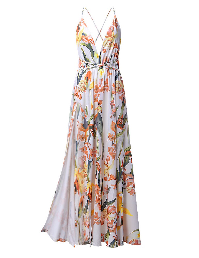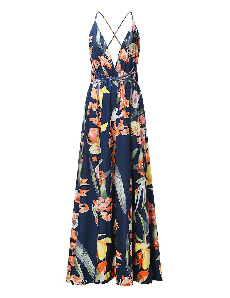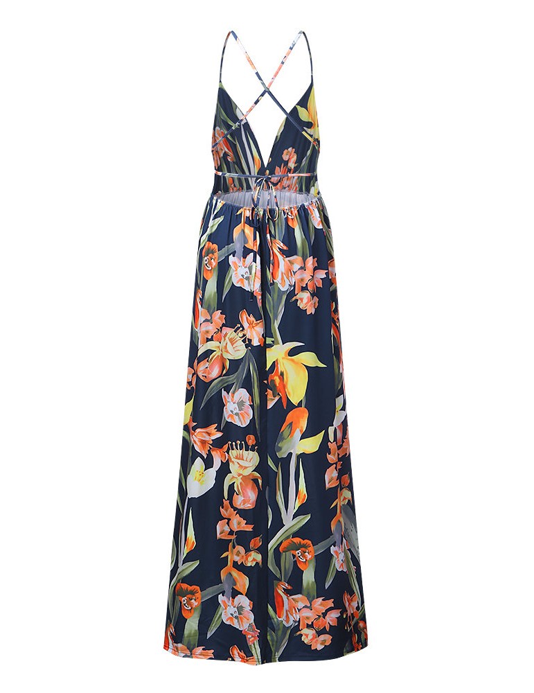Sexy Floral Print Backless Camisole Splited Maxi Dresses