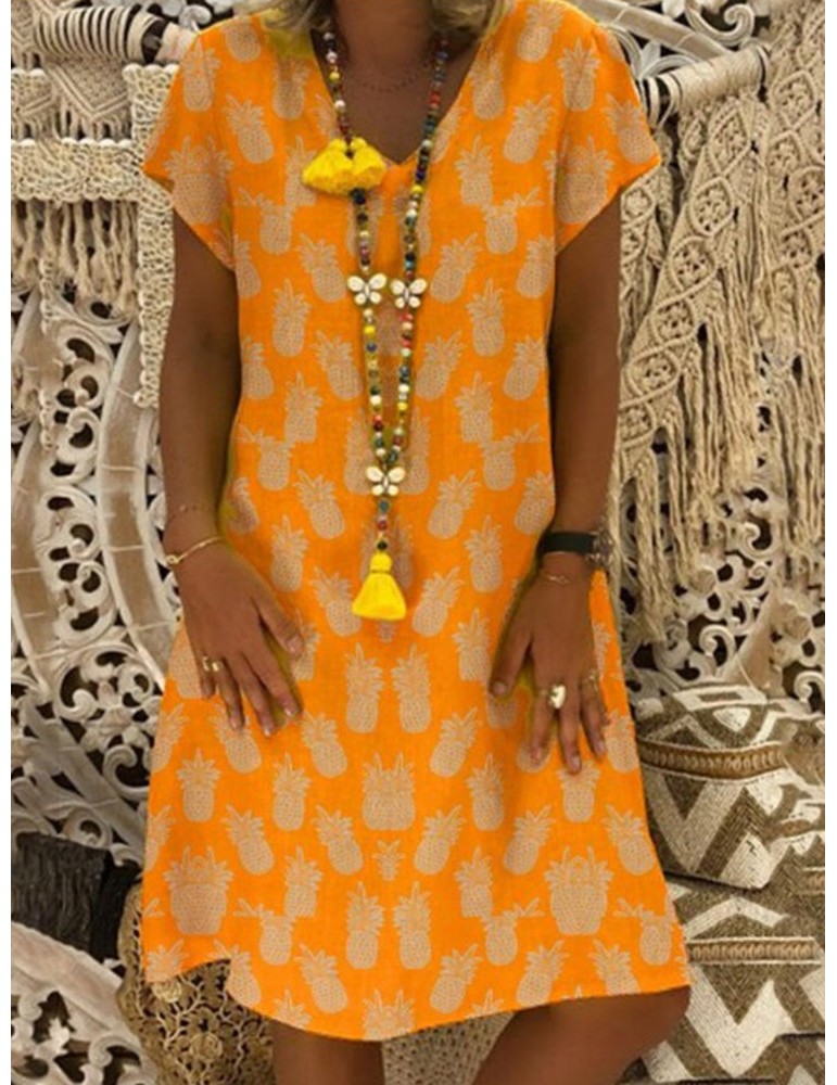 Pineapple Print Short Sleeve V-neck Casual Dress For Women