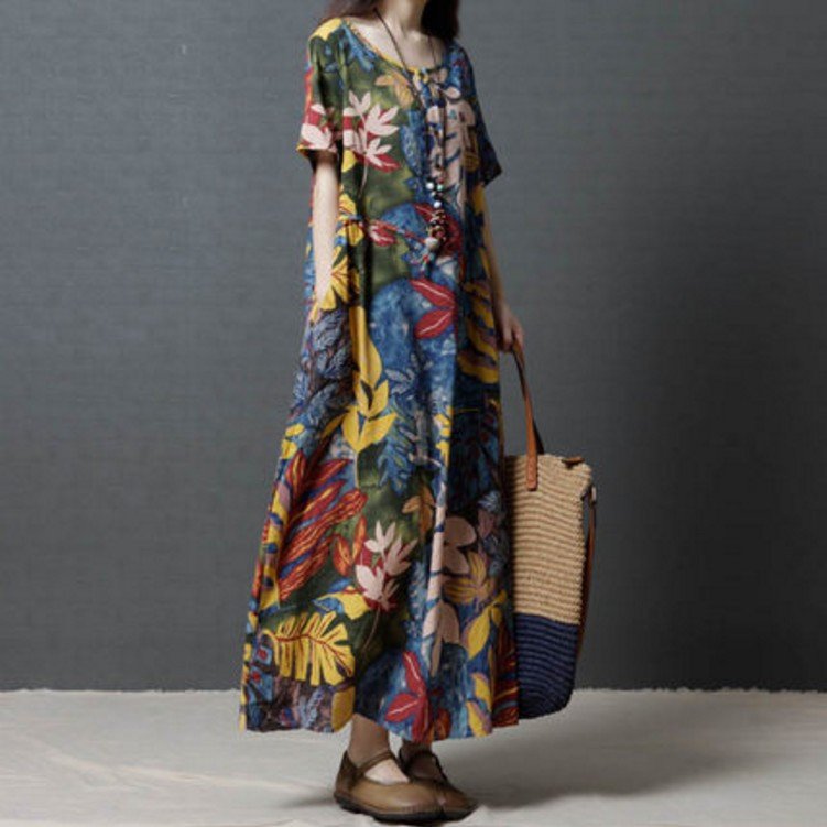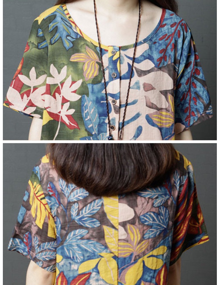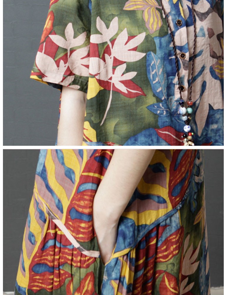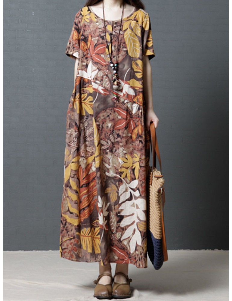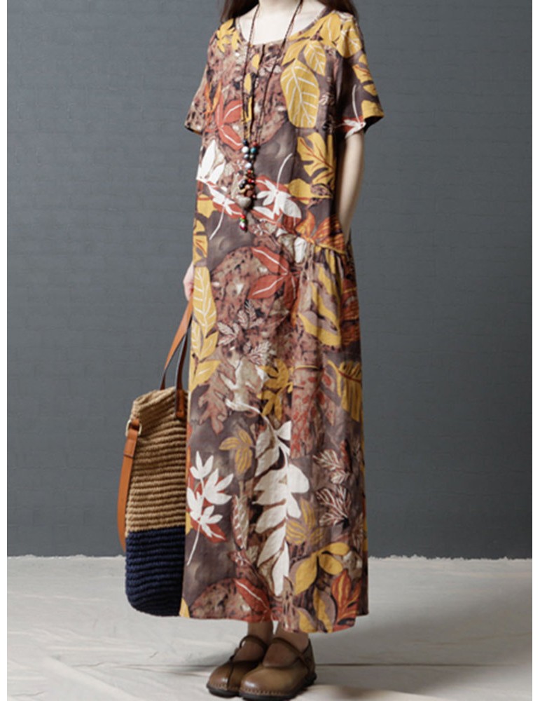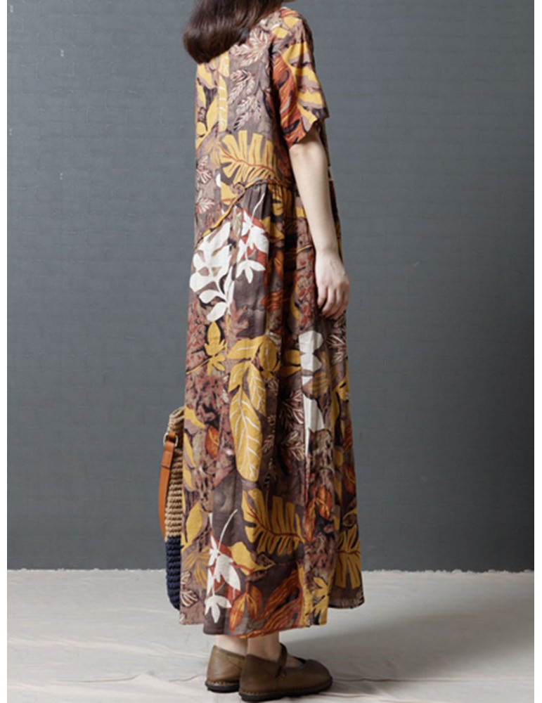 Leaves Print Multi-color Short Sleeve Vintage Maxi Dresses