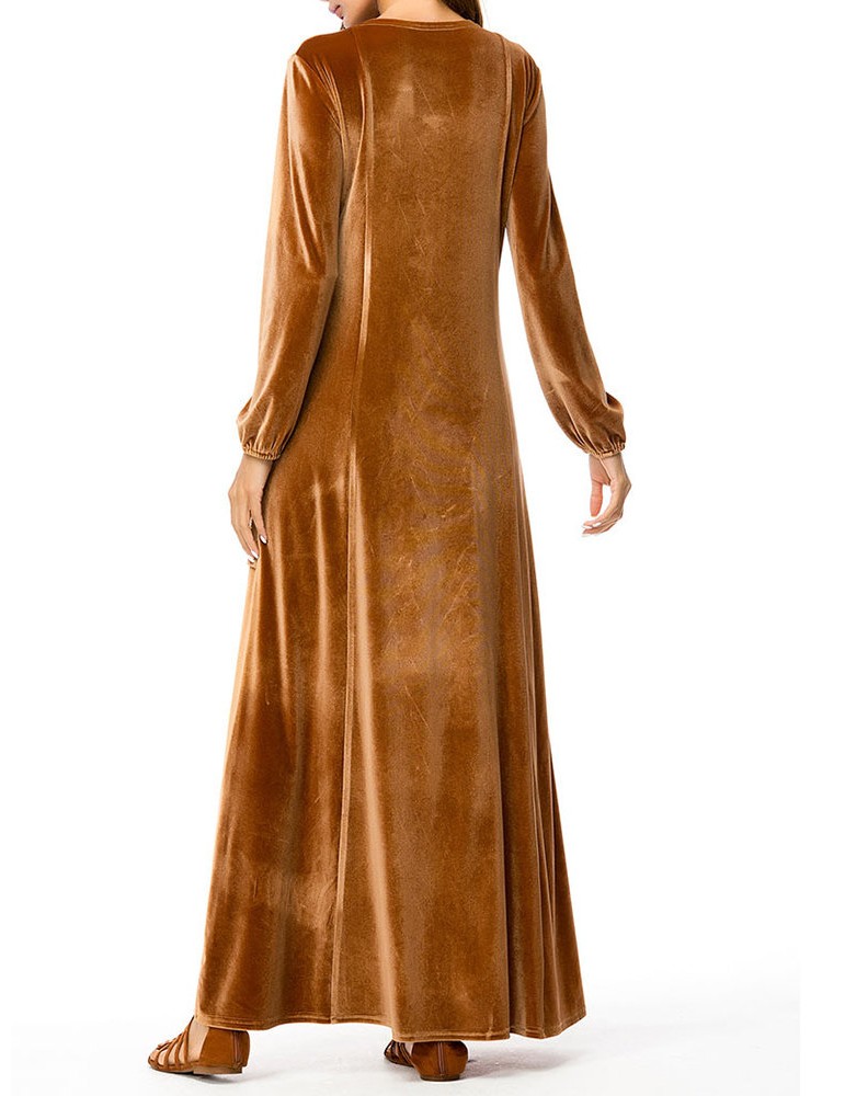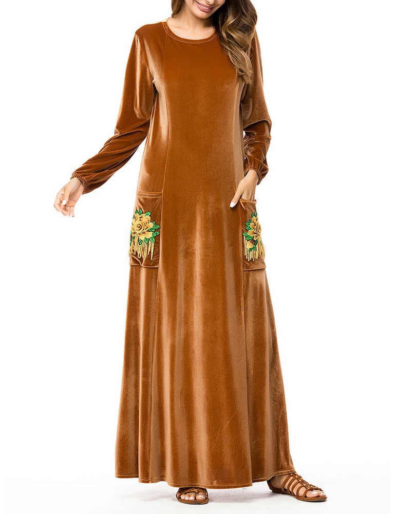 Islam Muslim Velvet Embroidery Pocket Brown Long Sleeve Dress