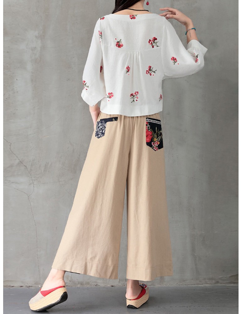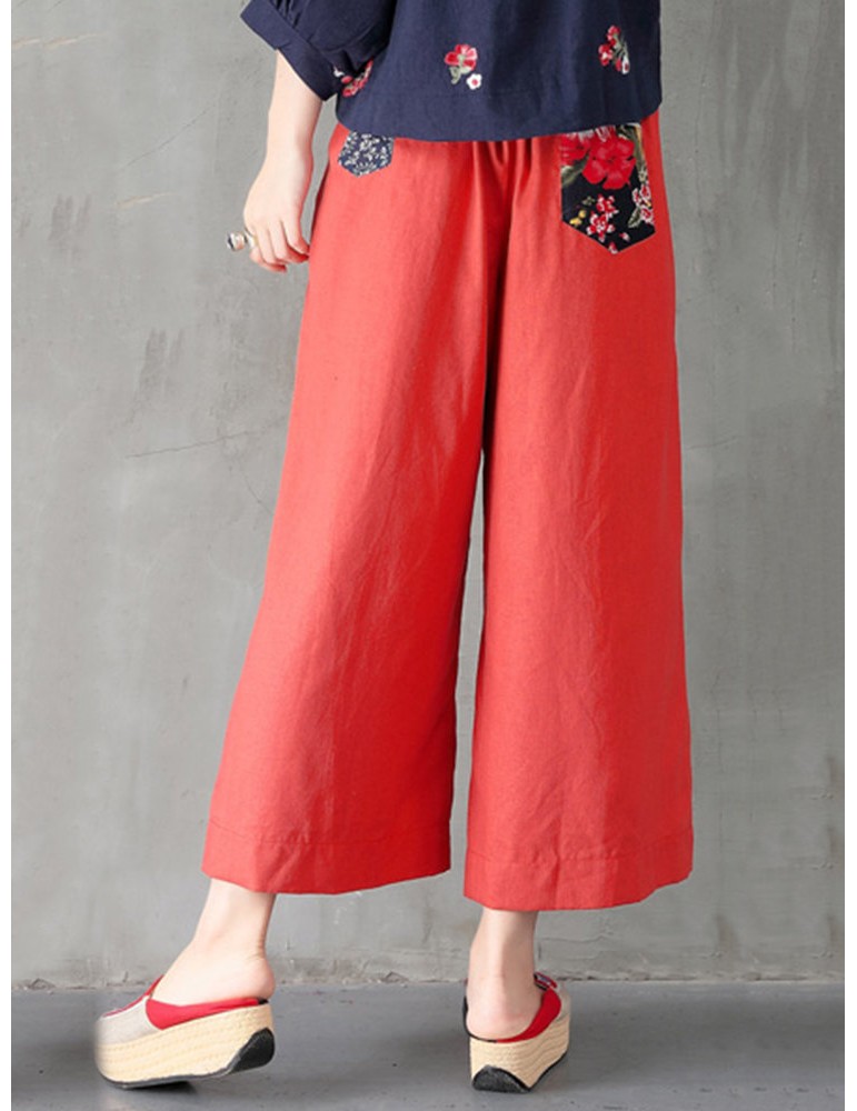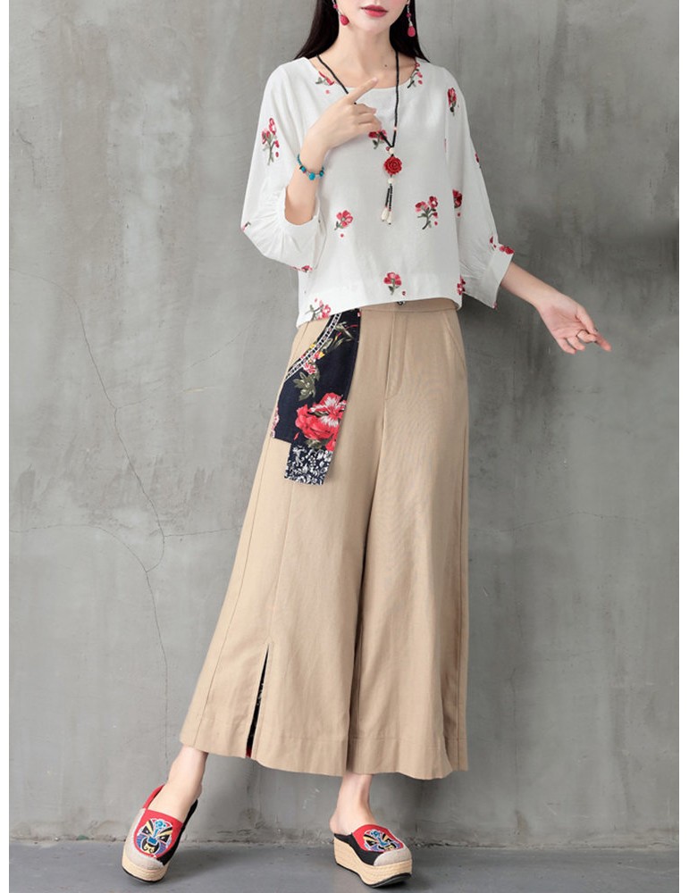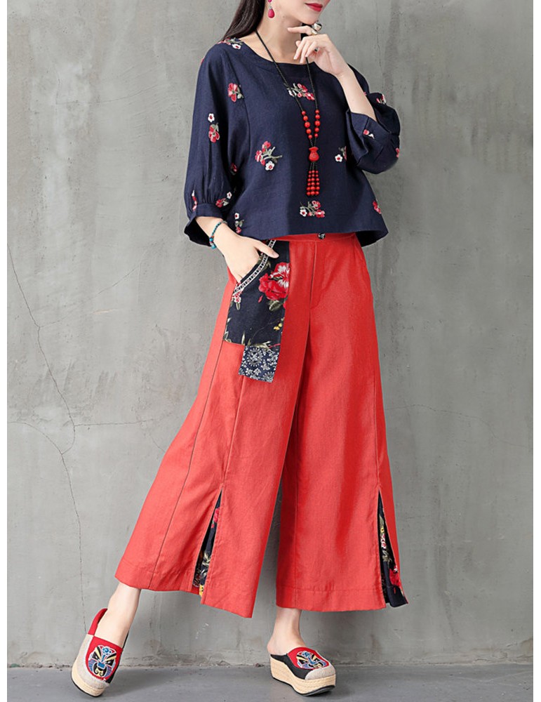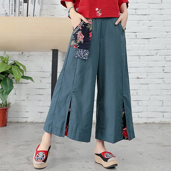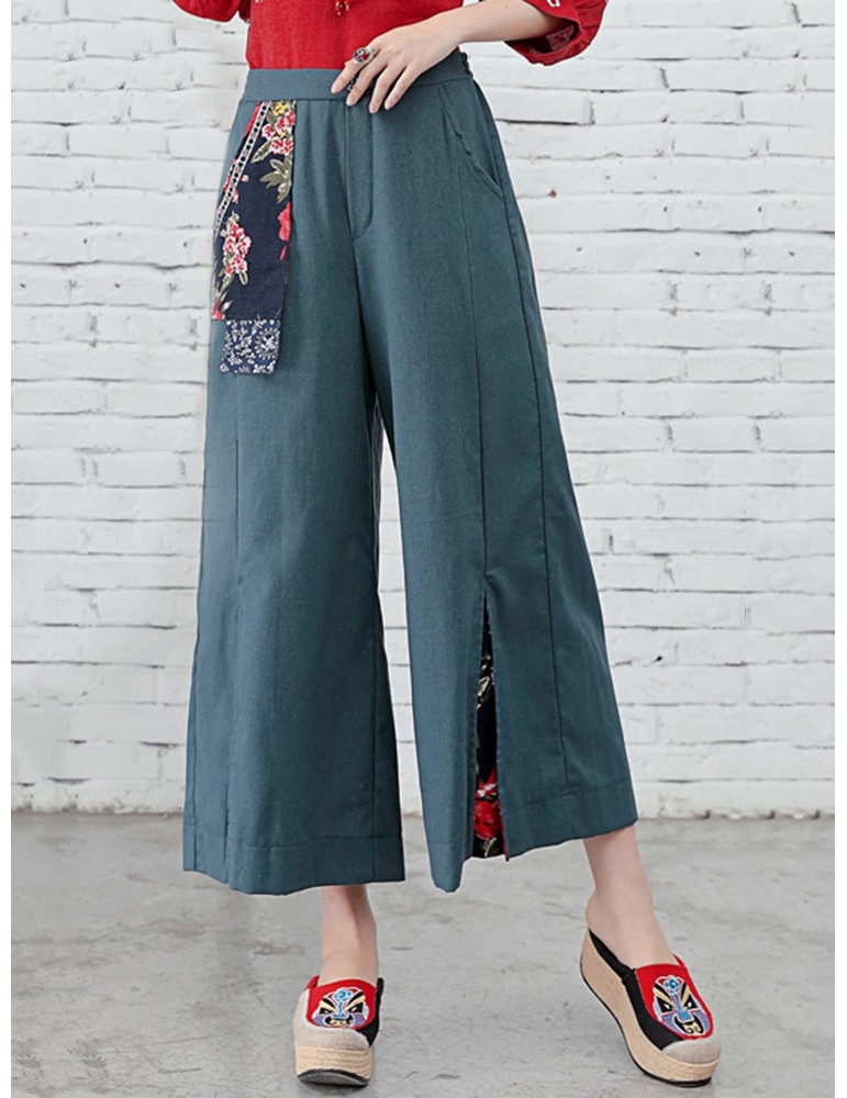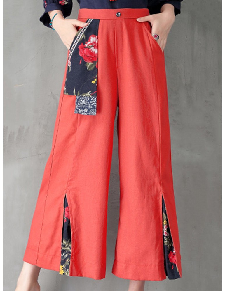 Folk Style Floral Print Patchwork Splited High Waist Women Pants