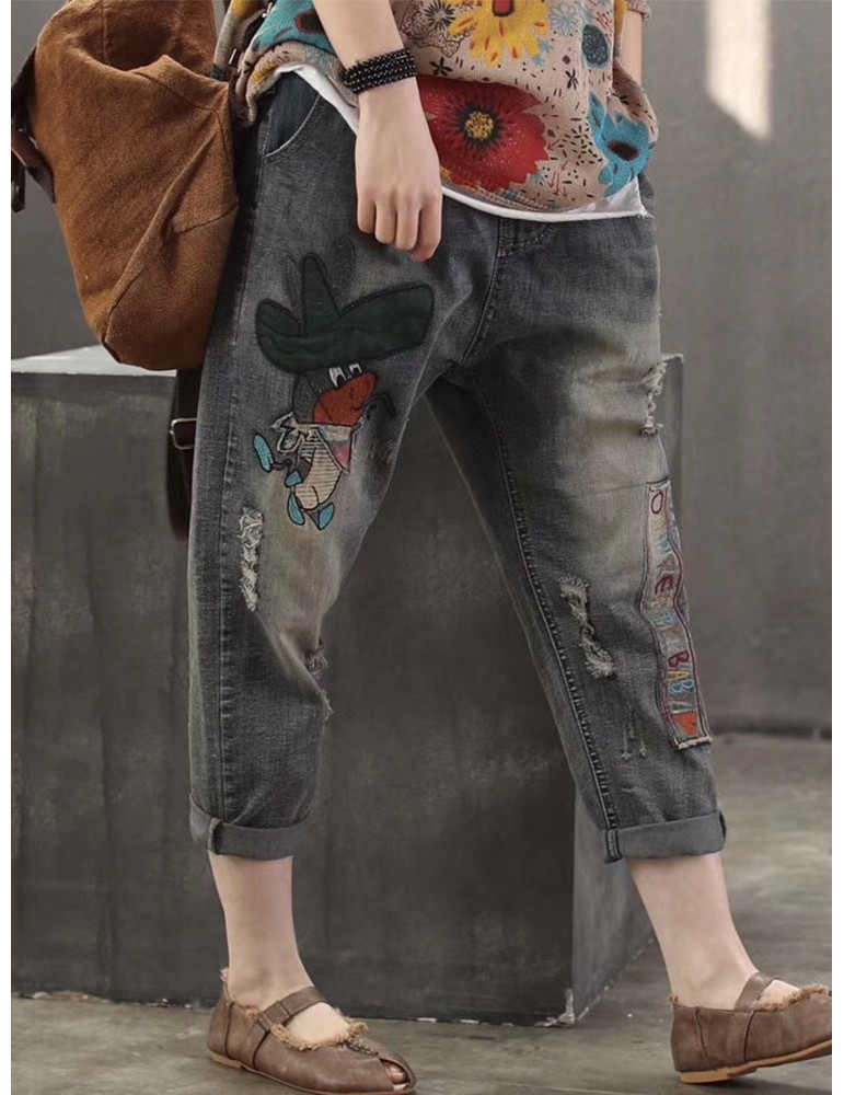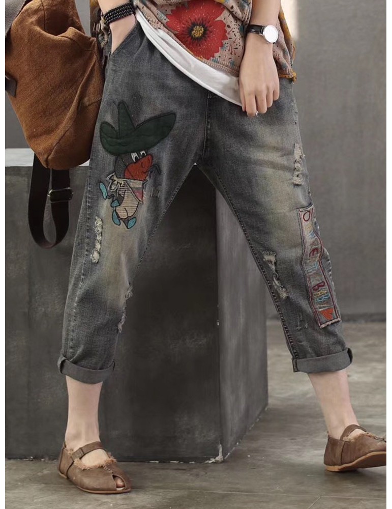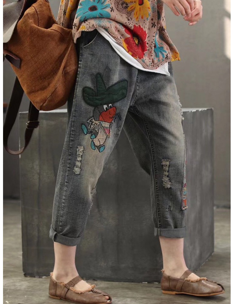 Casual Animal Patch Pockets Elastic Waist Denim