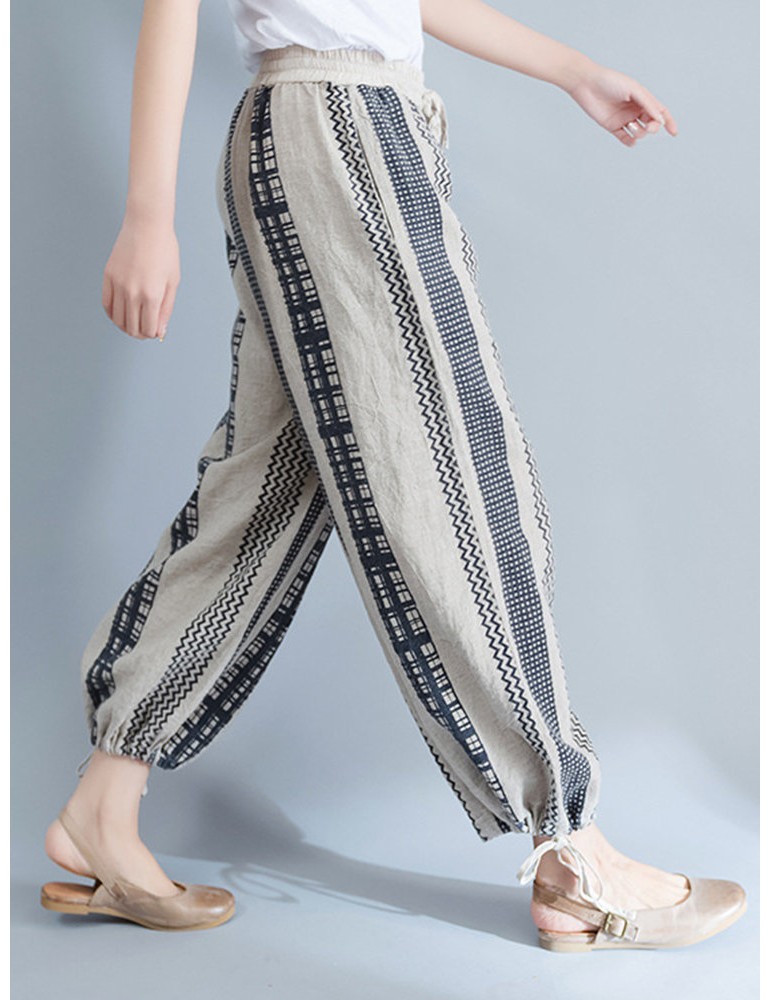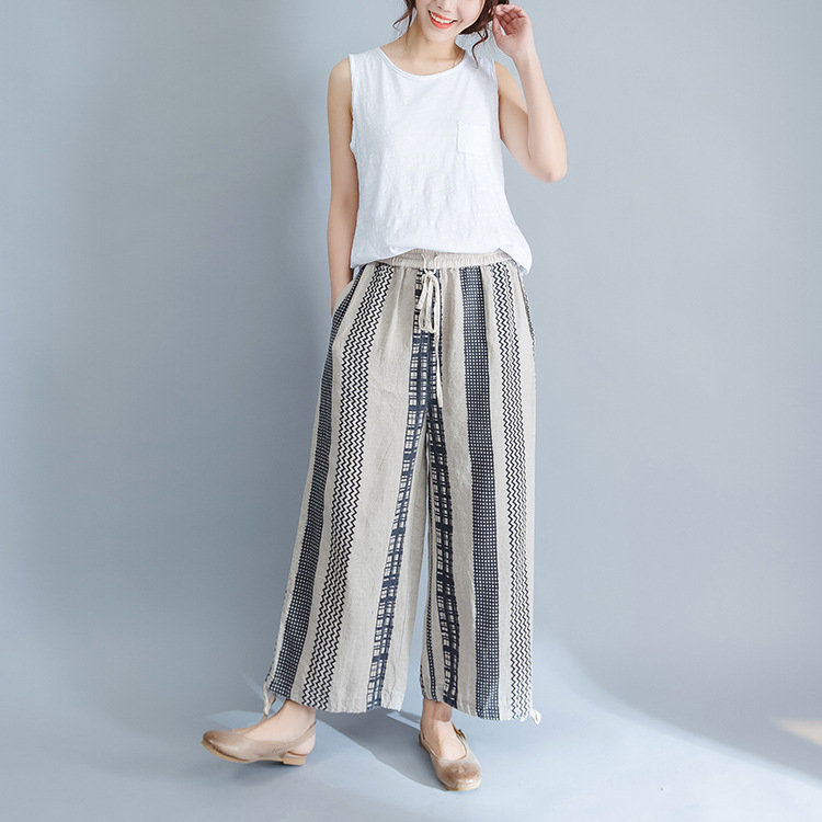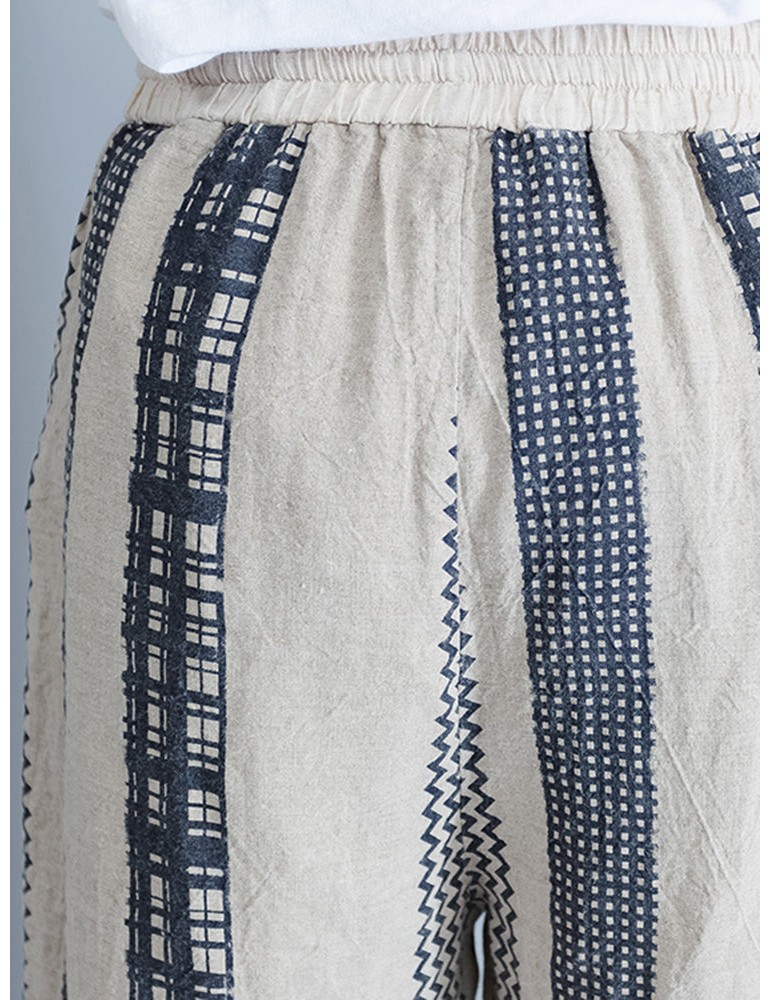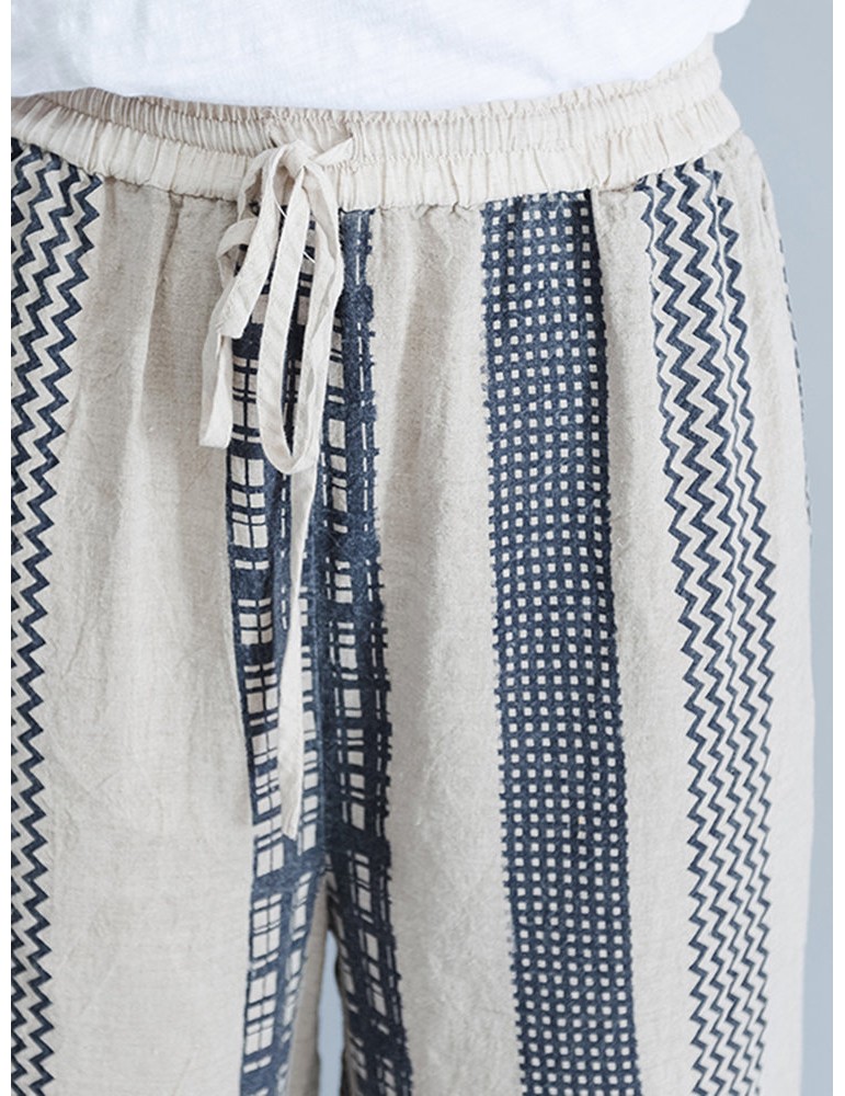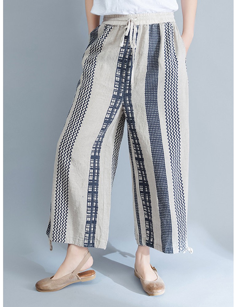 Stripe Plaid Print Wide Leg Drawstring Waist Casual Pants