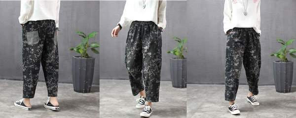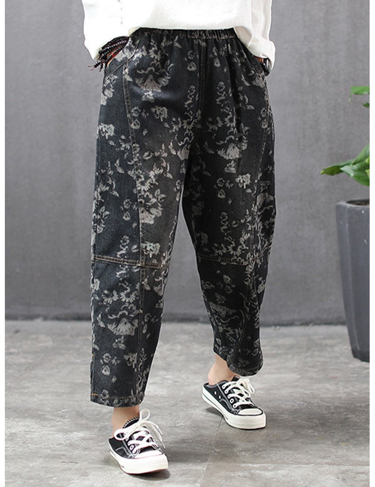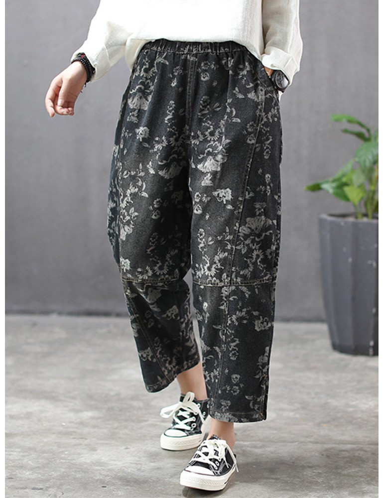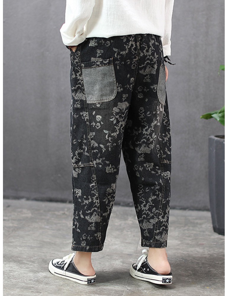 Printed Patchwork Pocket Loose Ankle Length Jeans
