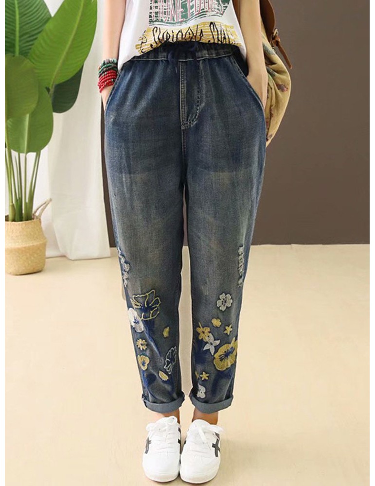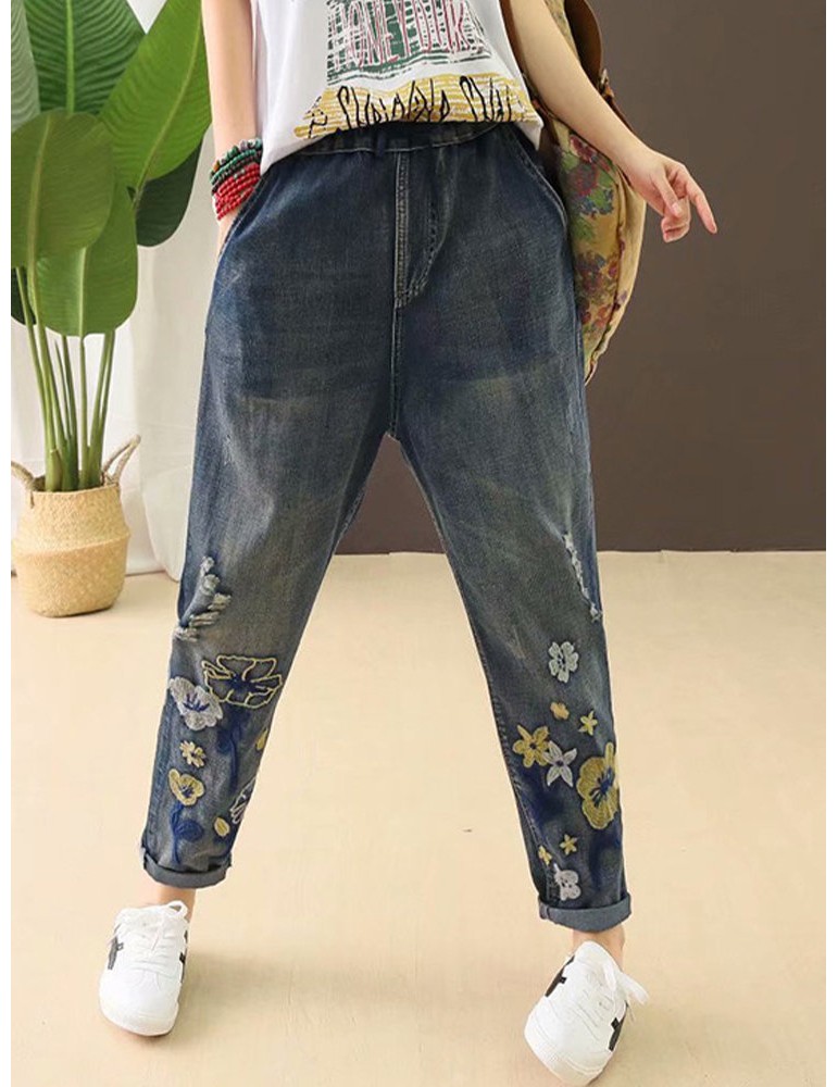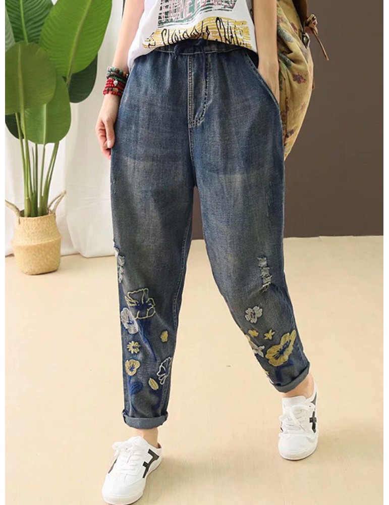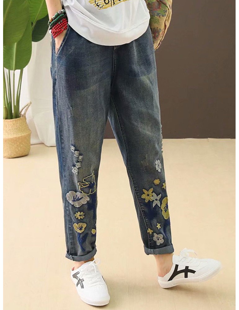 Casual Holes Flowers Embroidery Loose Old Harem Jeans