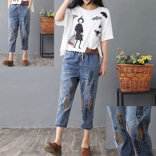 Vintage Embroidery Printed High Waist Mid-Calf Casual Jeans