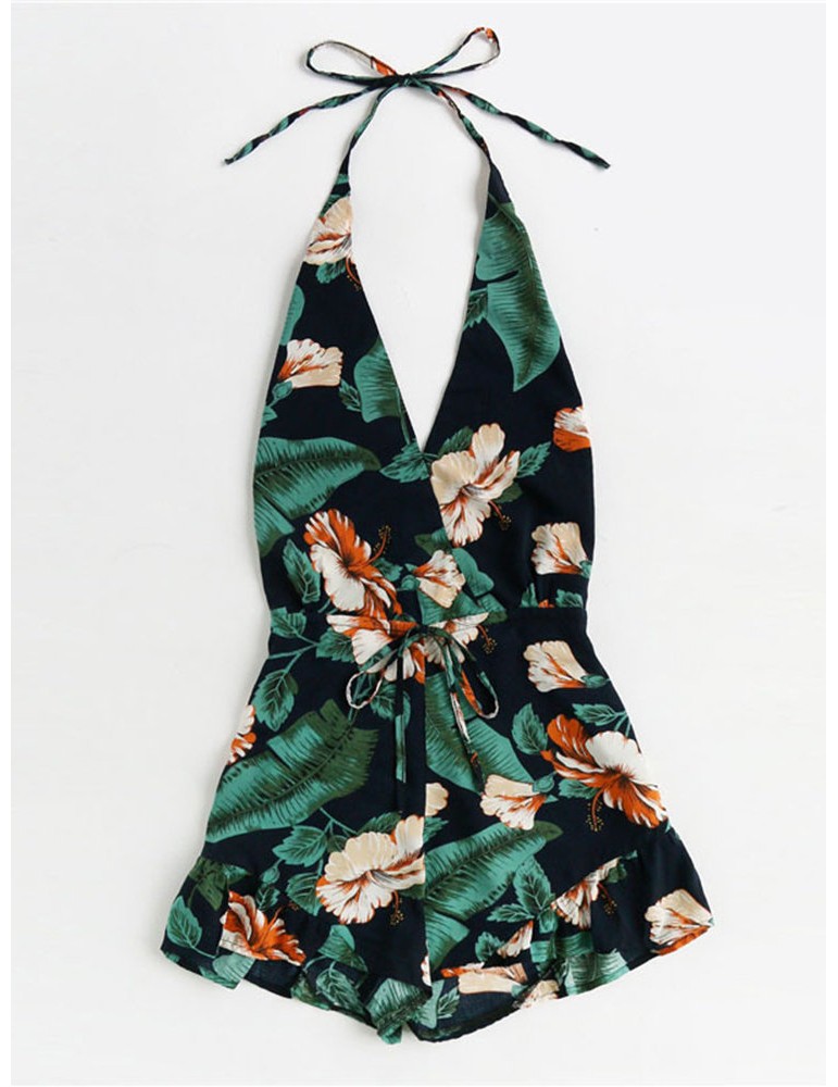 Sexy Backless Halter Floral Printed Bohemian Short Jumpsuits