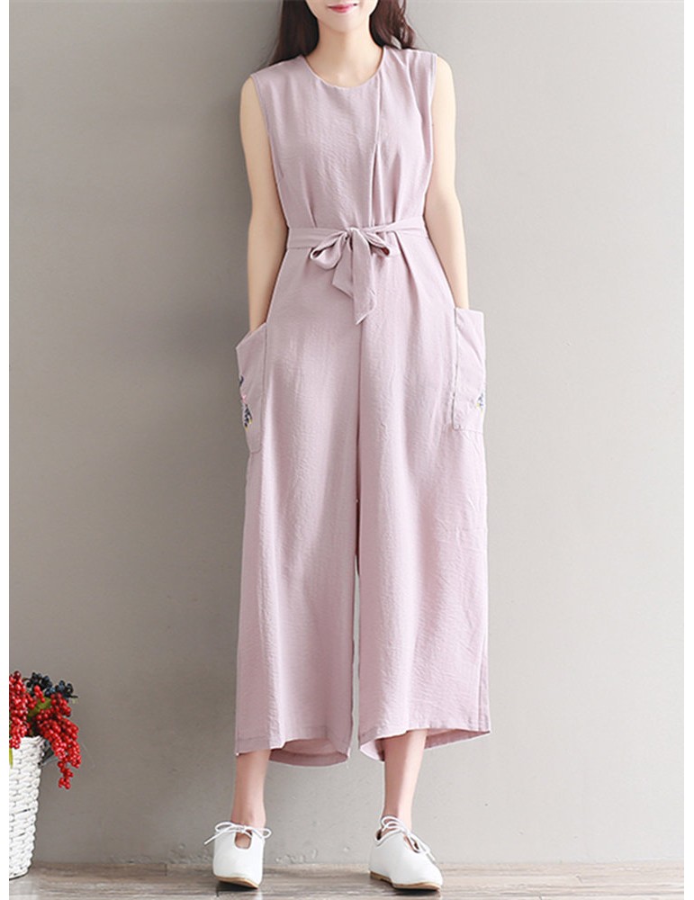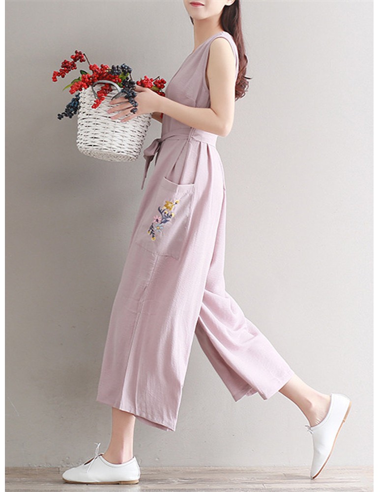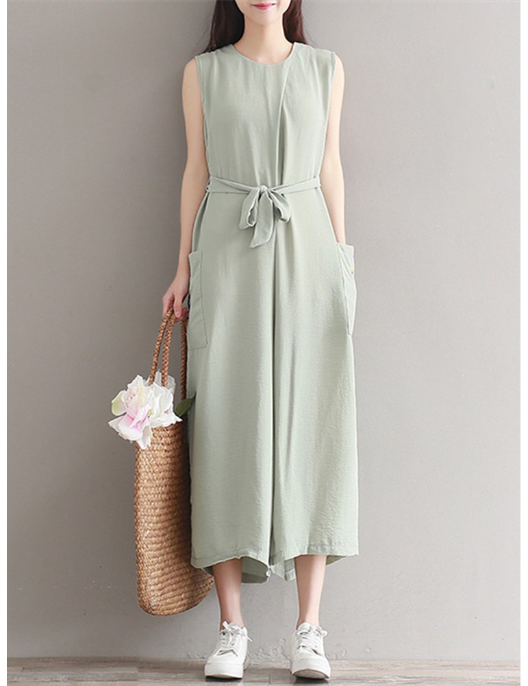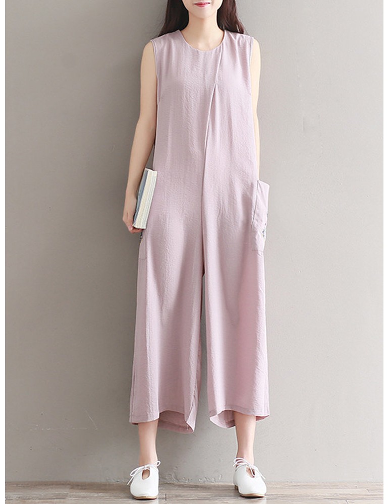 Women Vintage Sleeveless Pocket Back Zipper Wide Leg Jumpsuits