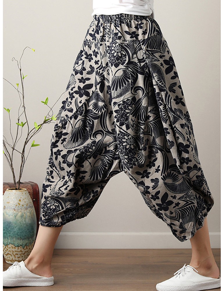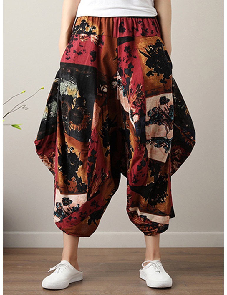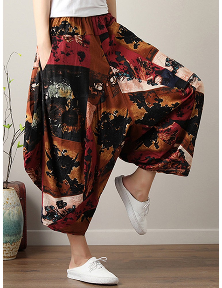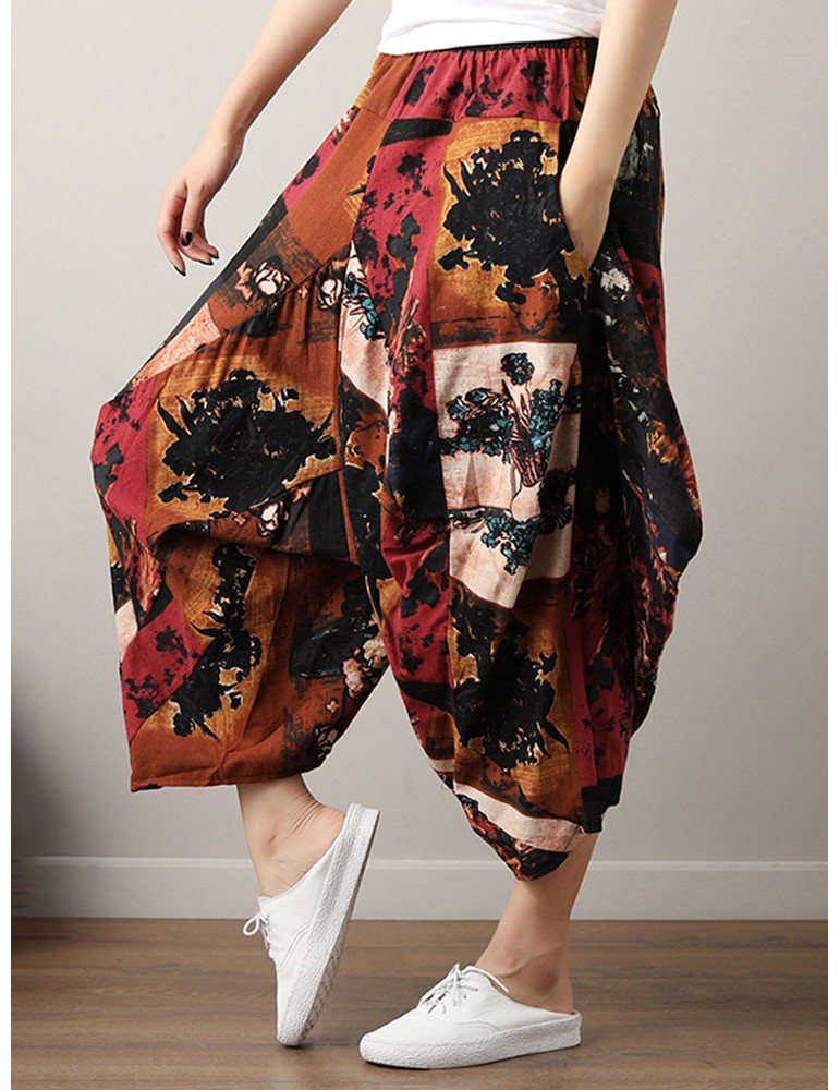 Ethnic Print Loose Irregular Elastic Waist Vintage Pants