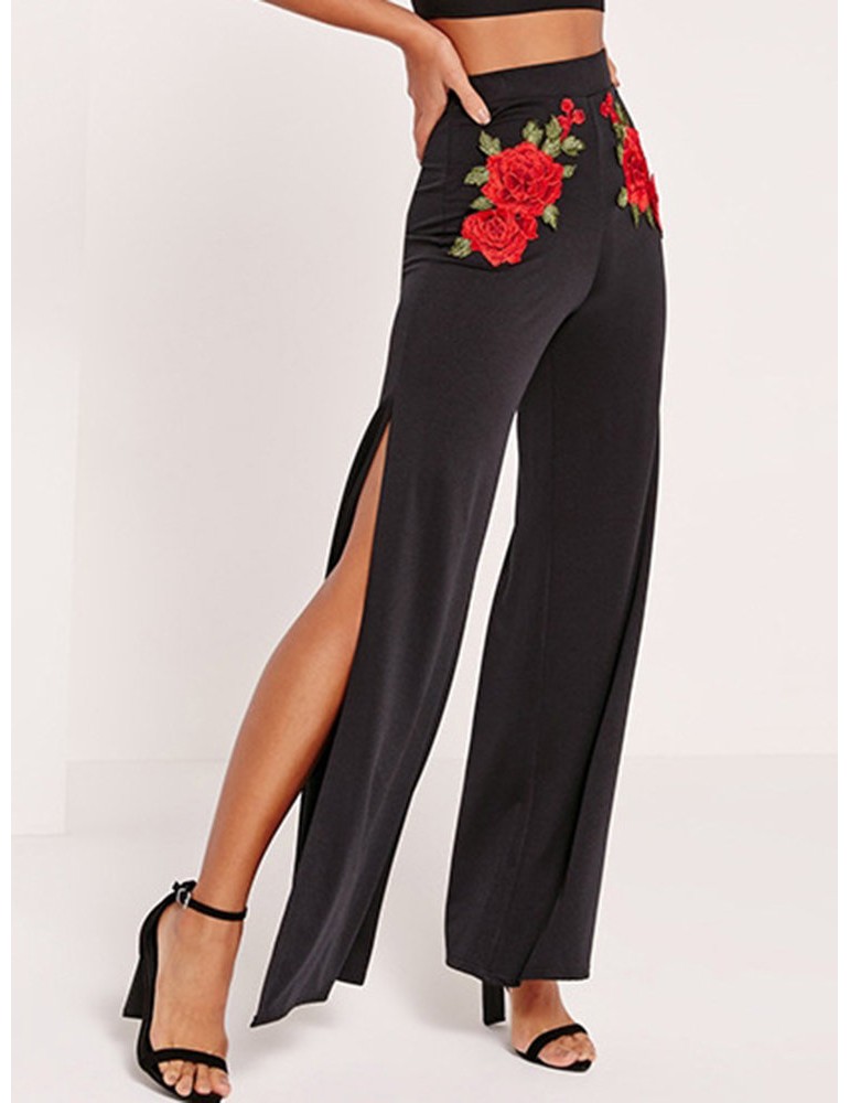Floral Embroidered Side Splited Vintage Pants