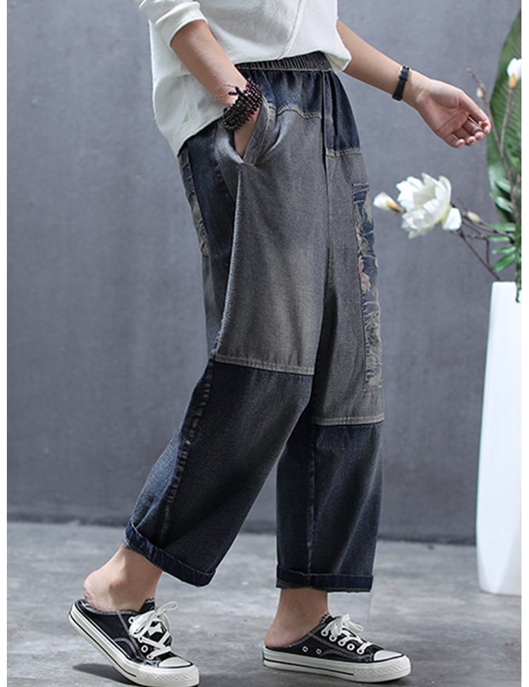 Embroidery Stickers Loose Pocket Harem Jeans For Women