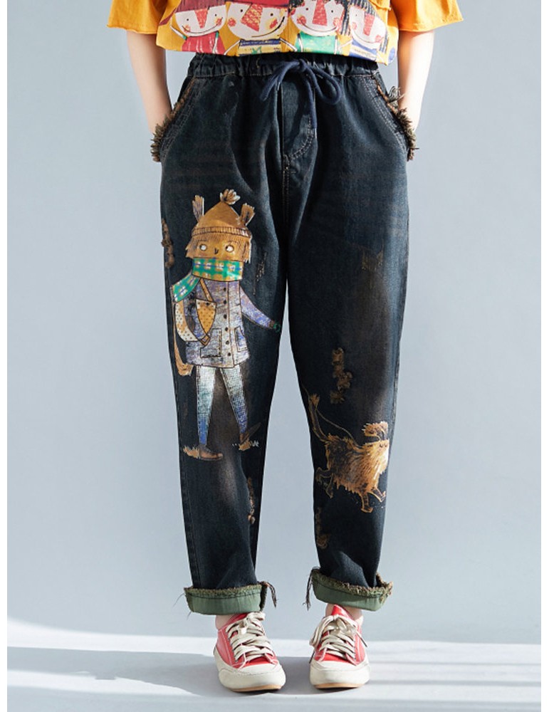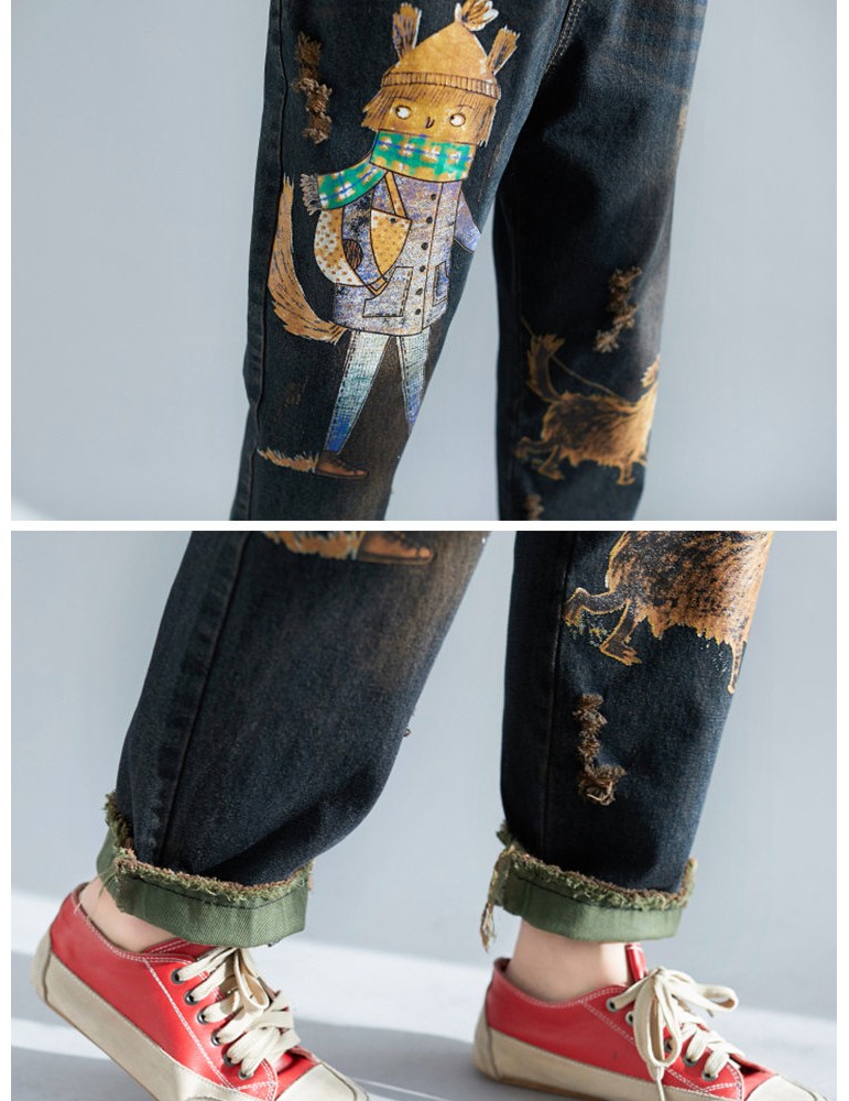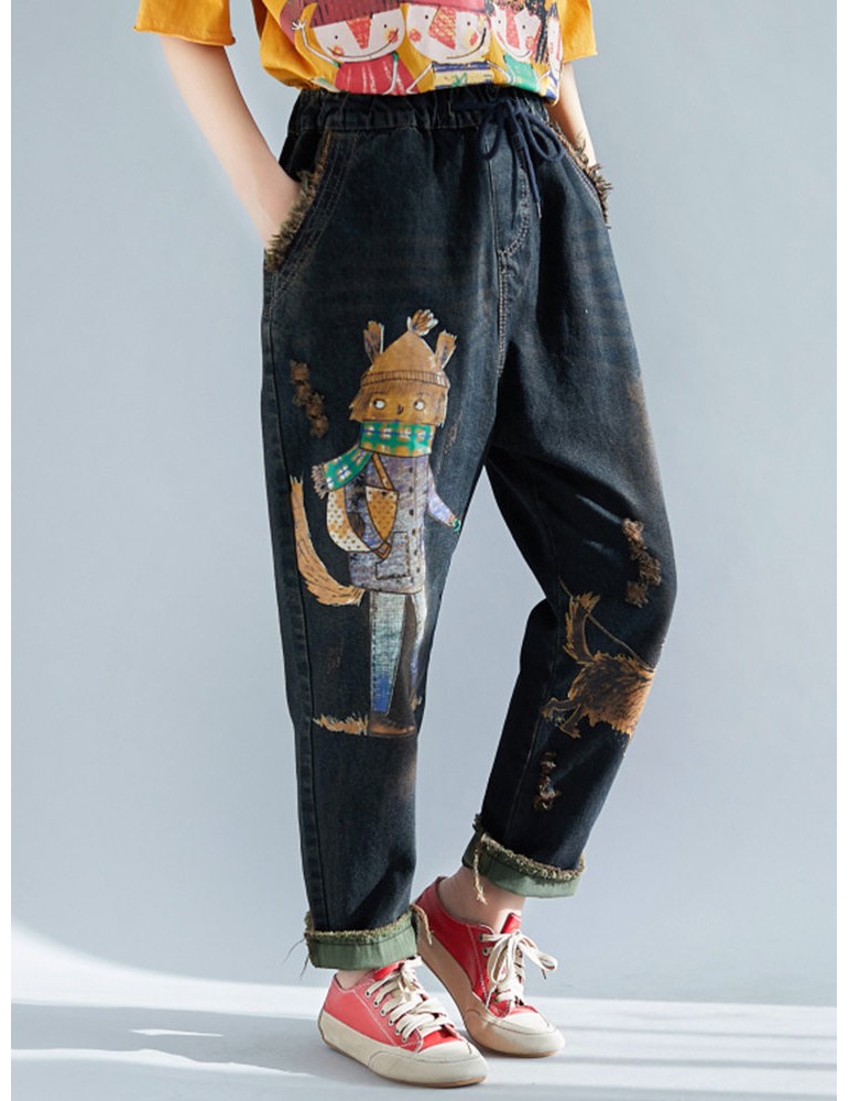 Cartoon Print Casual Ripped Harem Jeans For Women
