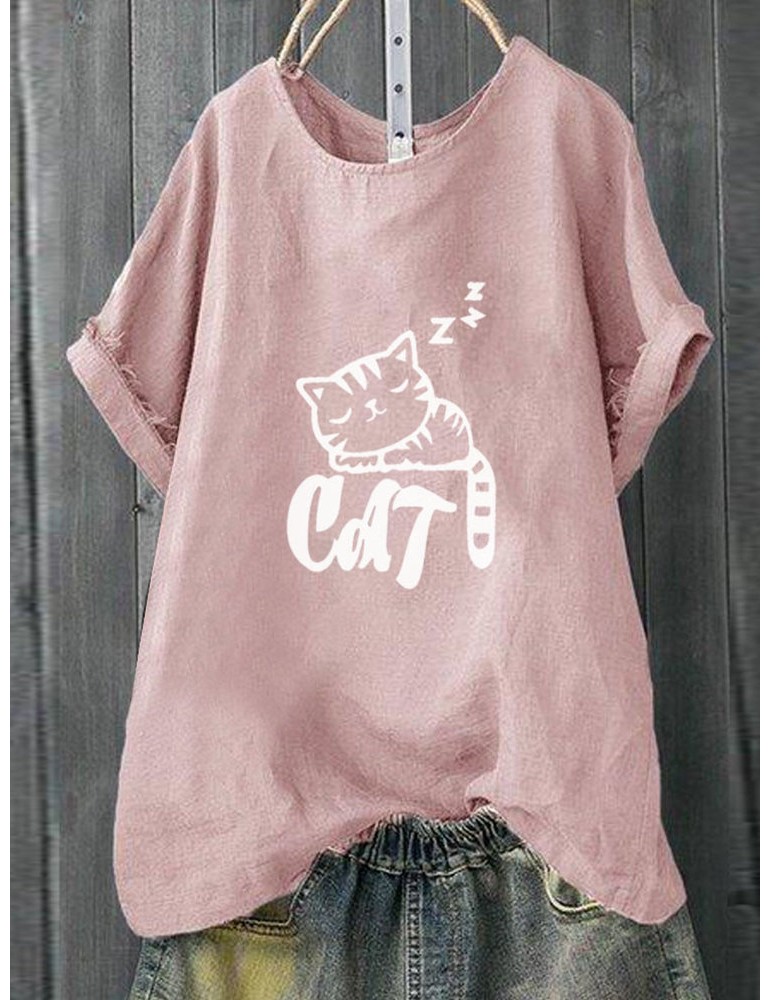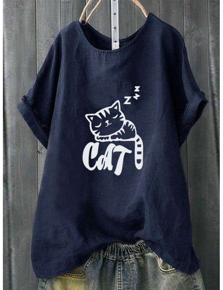 Casual Print Sleepy Cat Short Sleeve T-Shirt