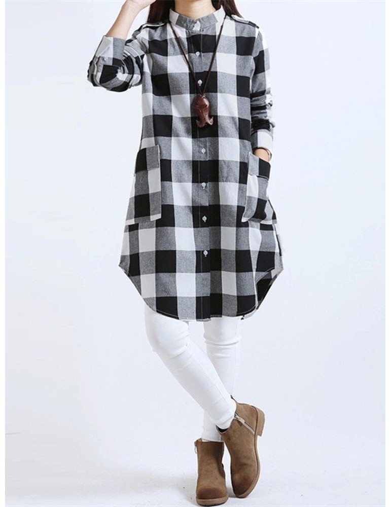 Women Long Sleeve Boyfriend Scottish Plaid Pockets Button Blouses
