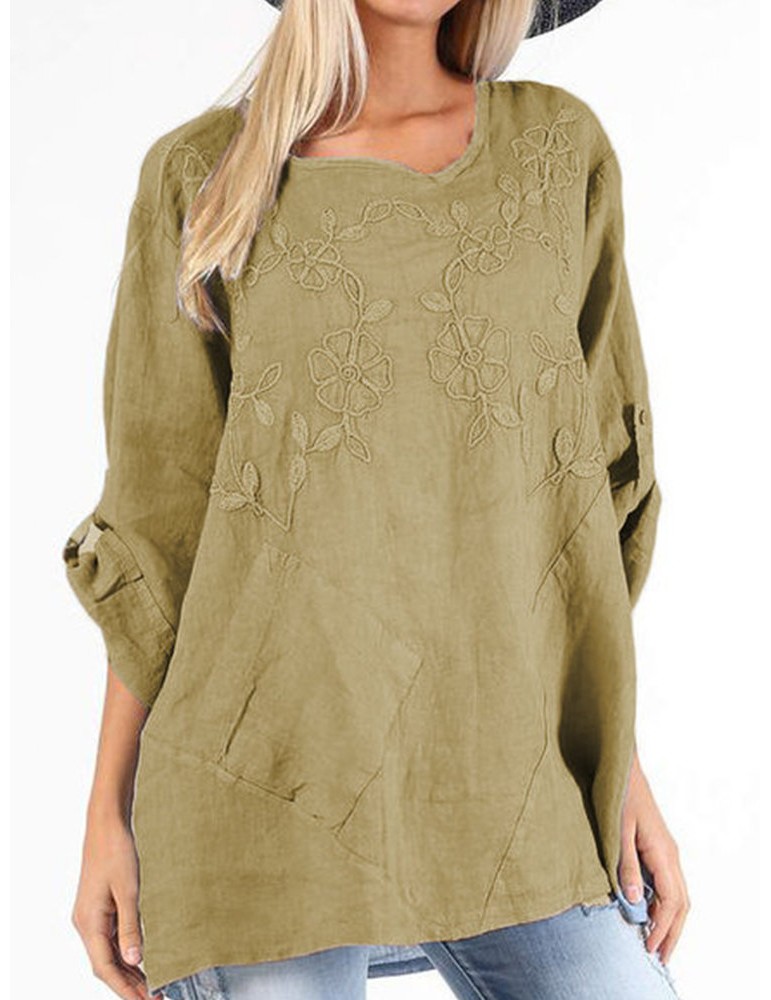 Vintage Embroidery Floral Solid Color Shirt