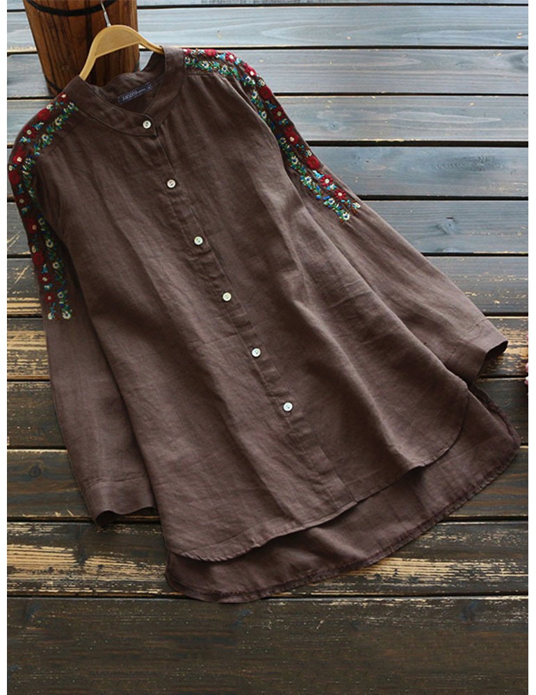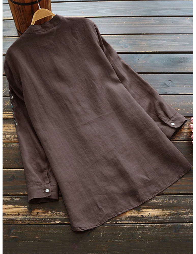 Vintage Embroidery Band Neck Button Long Sleeve Blouse