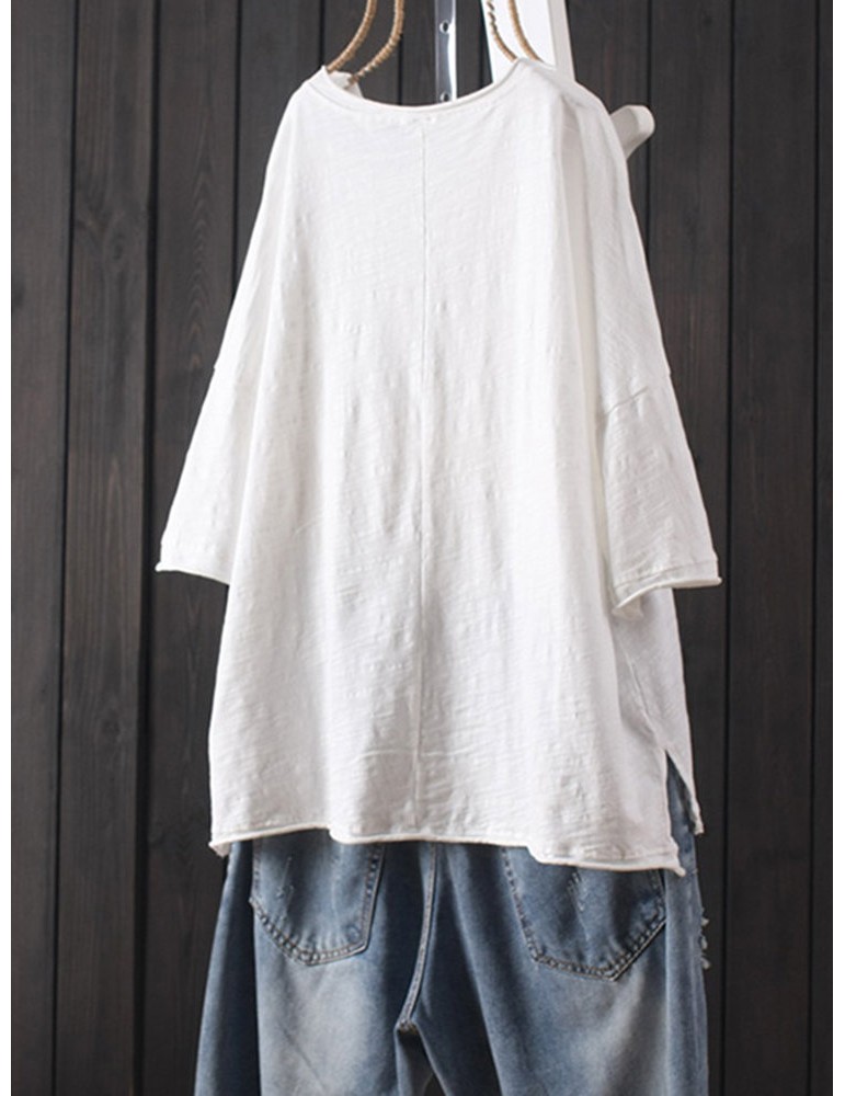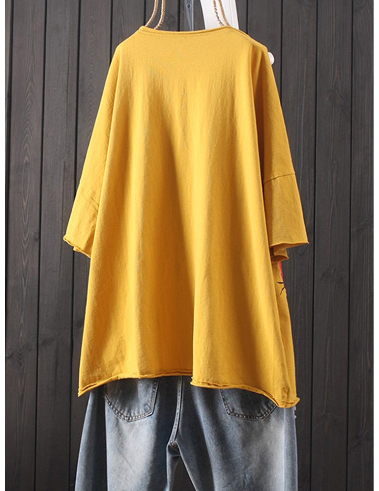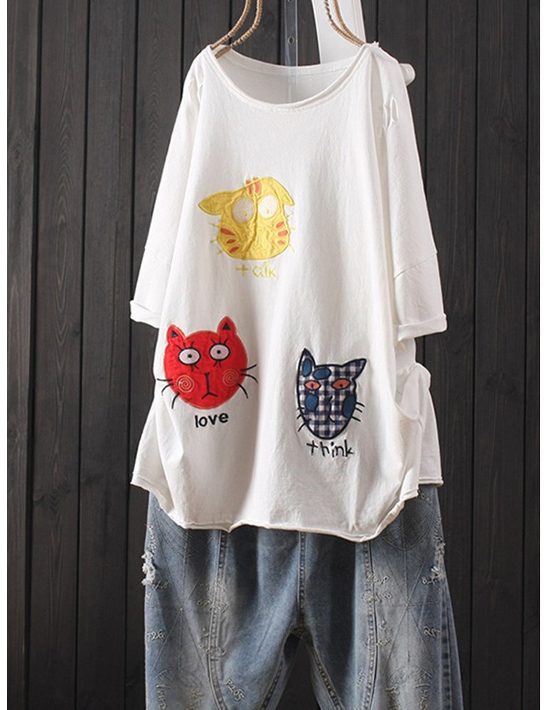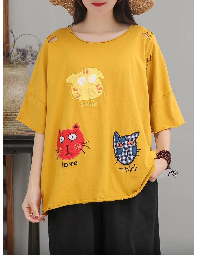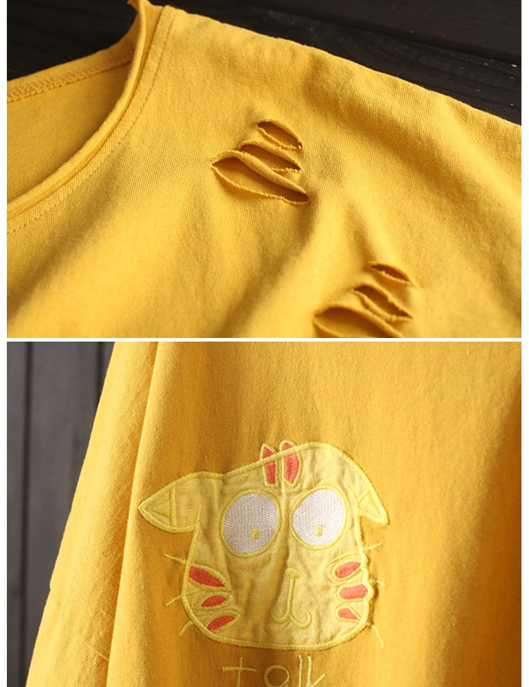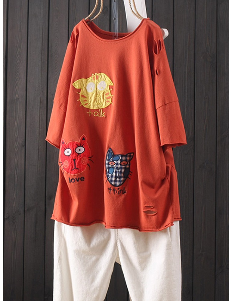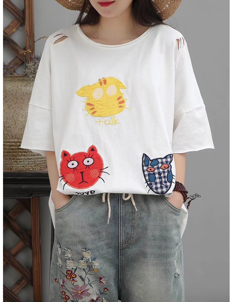 Cat Patch Embroidered Half Sleeve Distressed T-Shirt