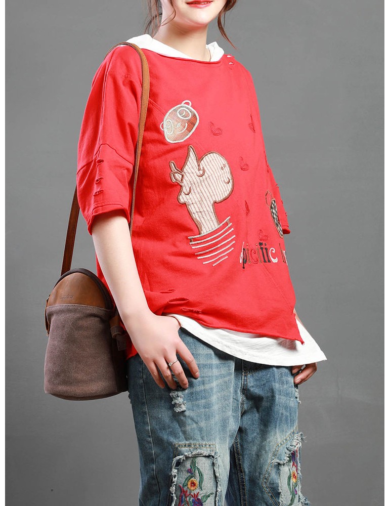 Cartoon Embroidery Print Short Sleeve Casual T-Shirt