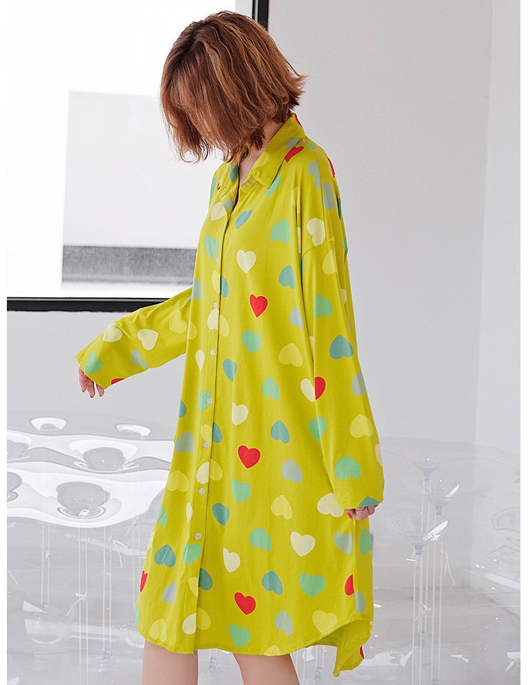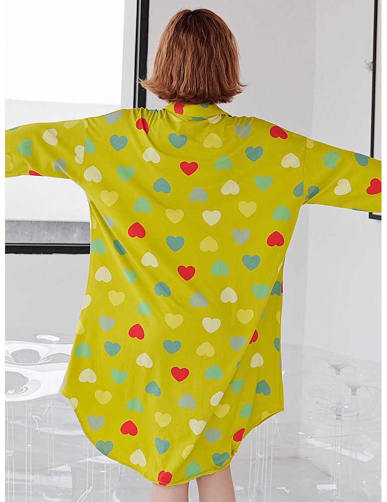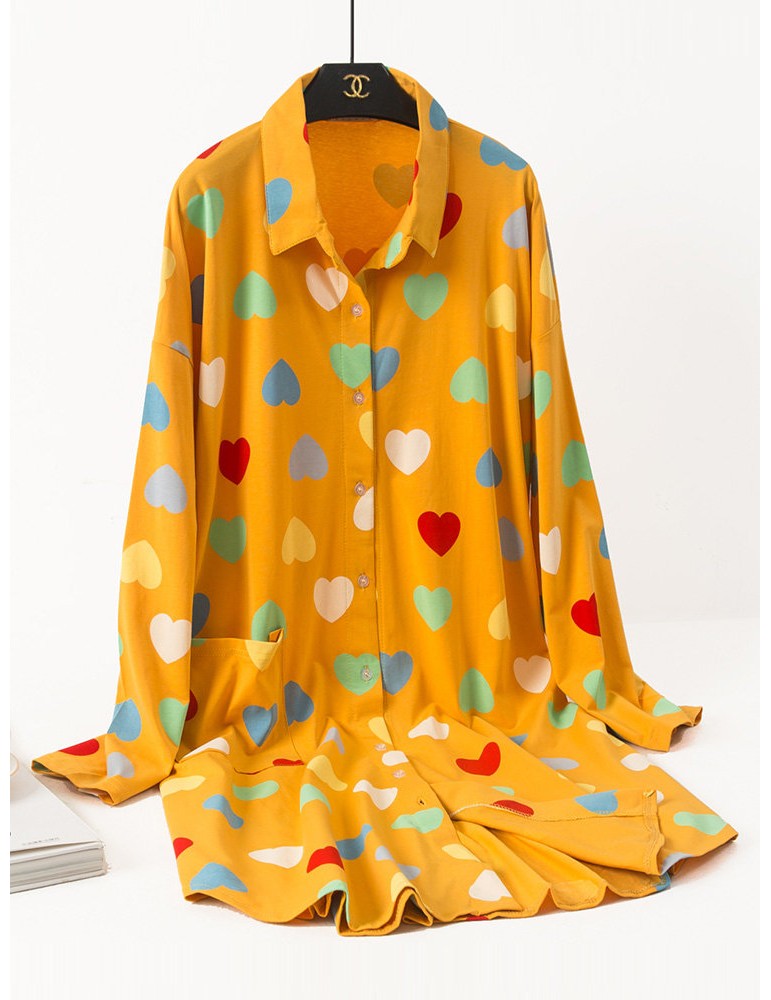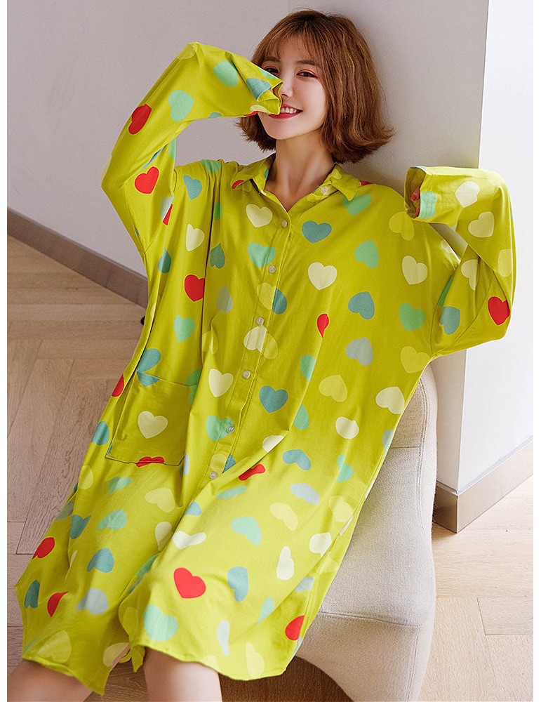Plus Size Cotton Pajamas Long Sleeves Hearts Print T-Shirt Loose Nightdress