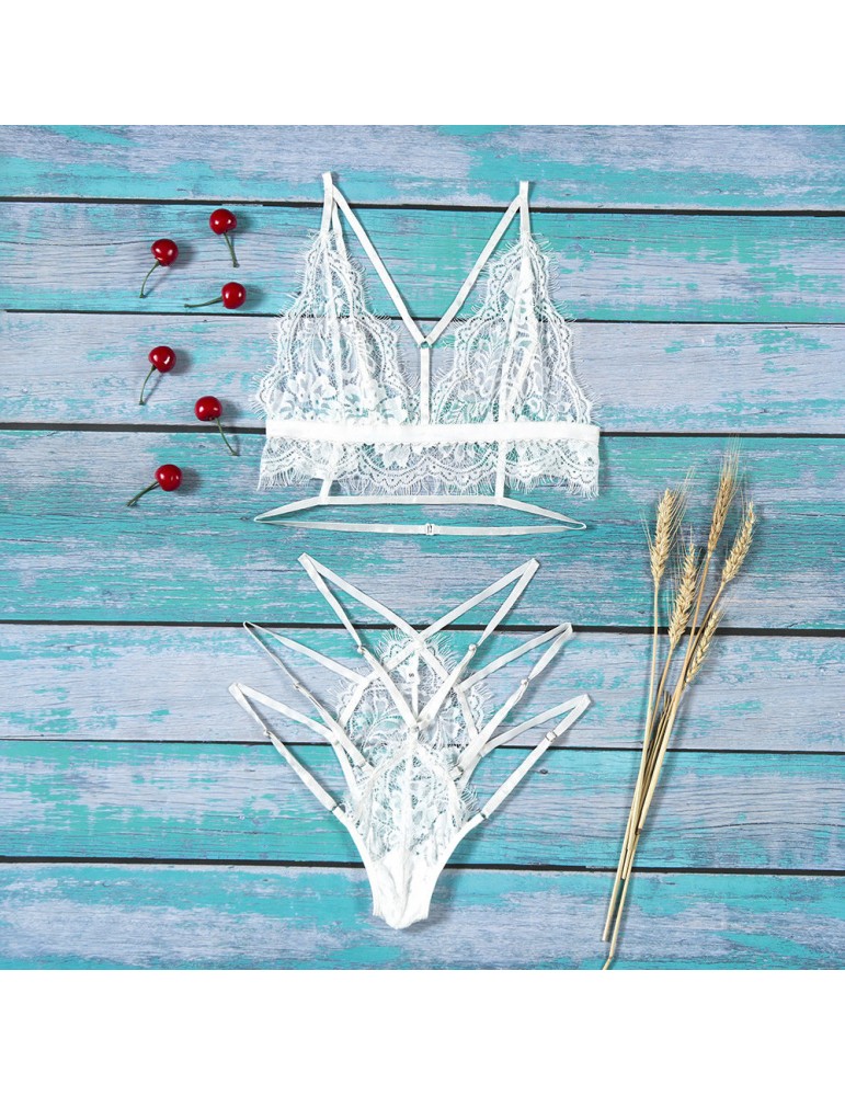 Hollow Out See Through Lace Plunge Peep Bra And Panty Set