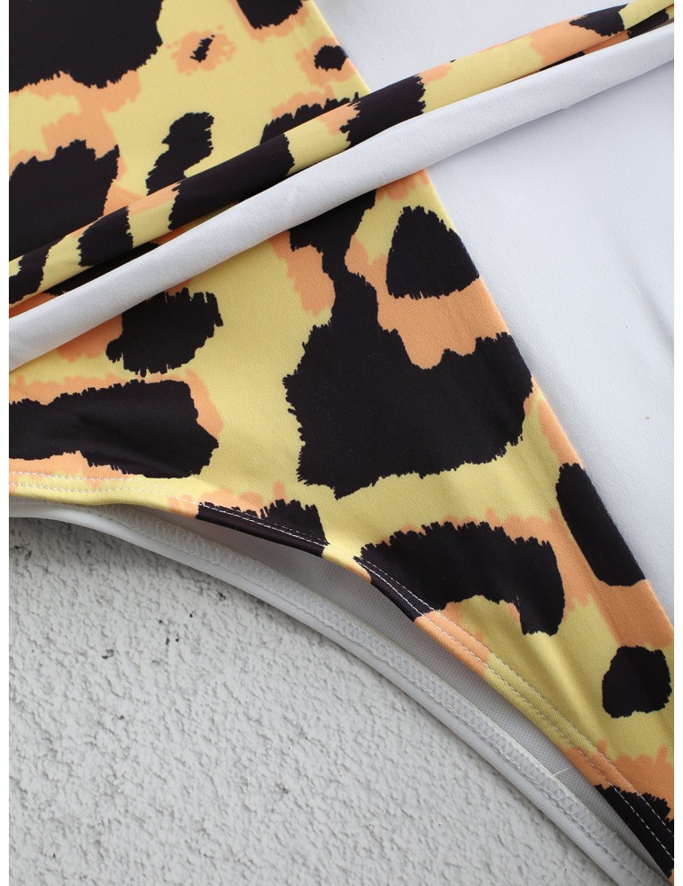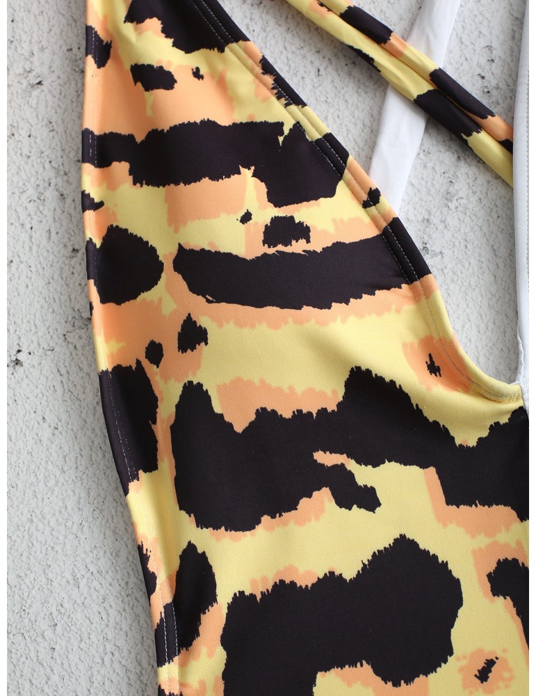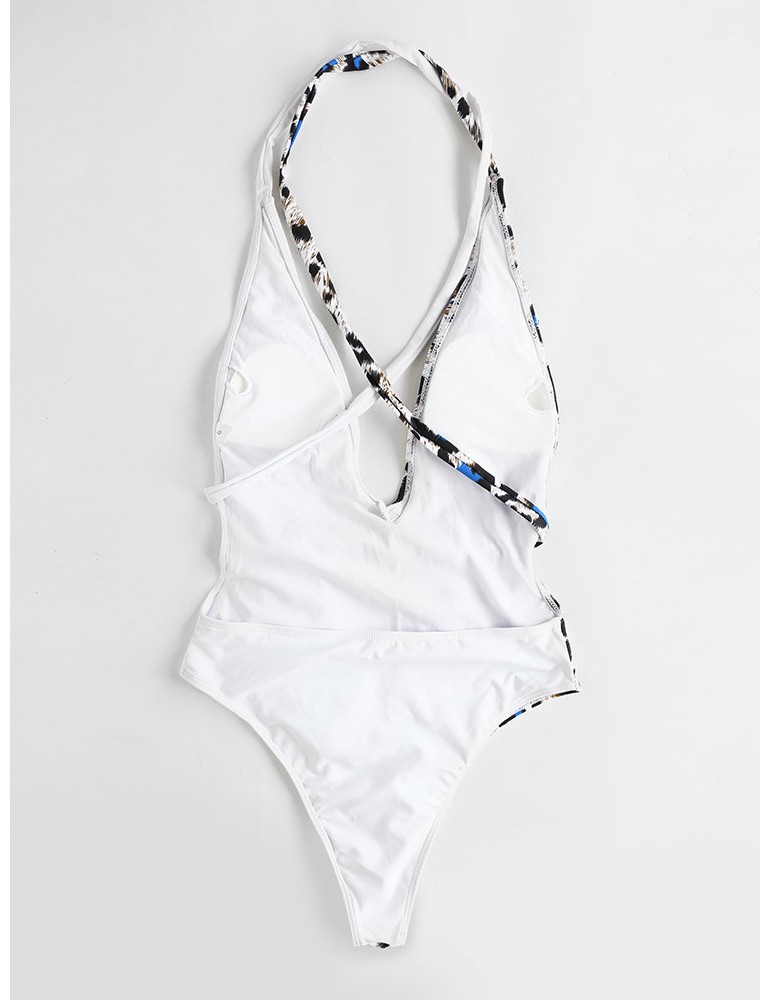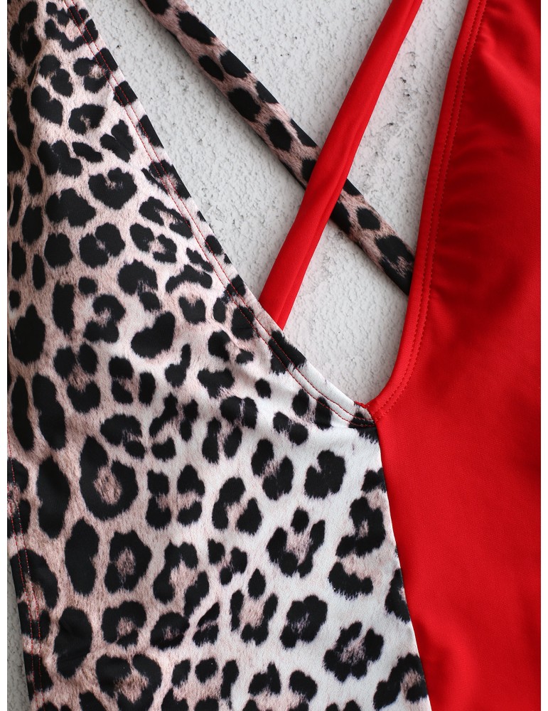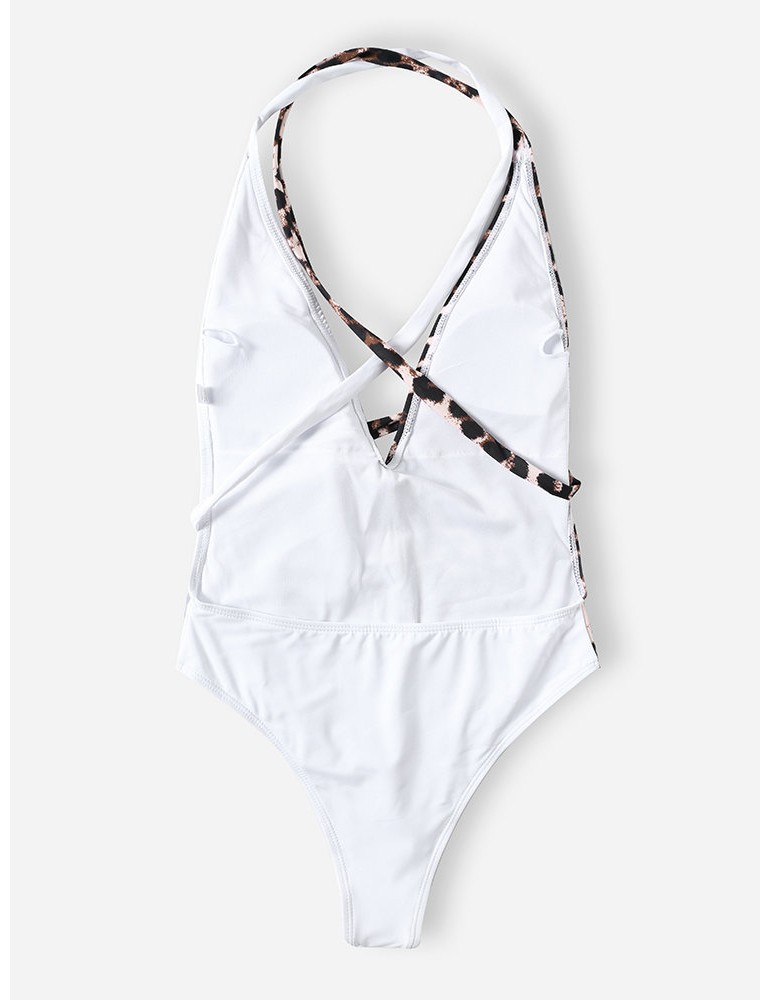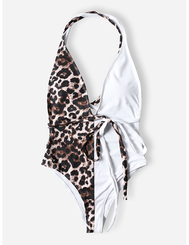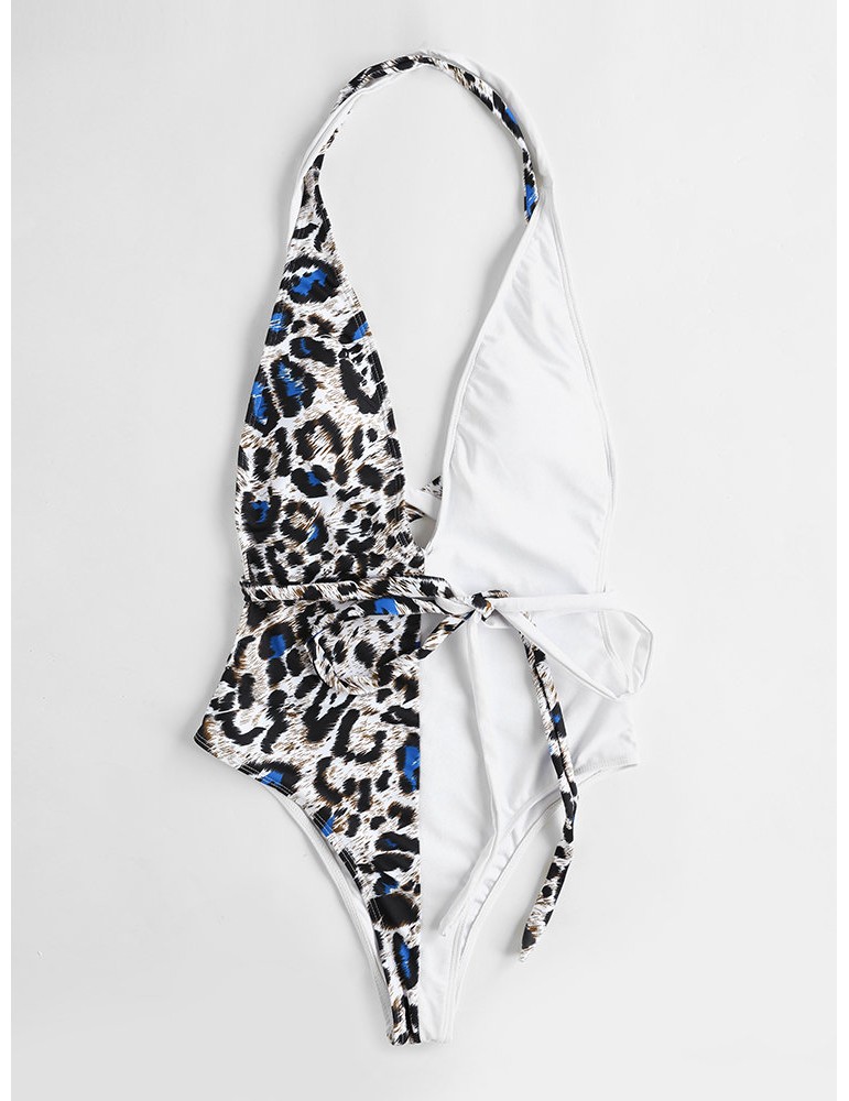 Leopard Print Slimming One Piece Patchwork Tie Belt Backless Sexy Women Swimwear