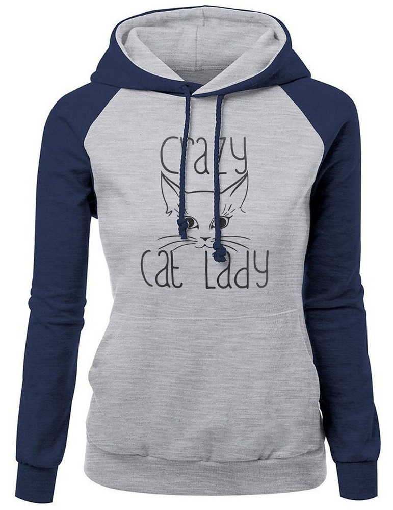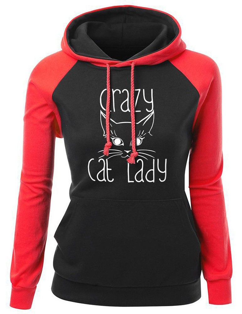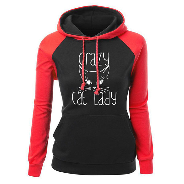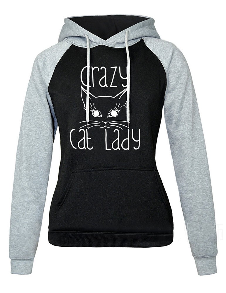 Women Cat Printed Contrast Color Hooded Long Sleeve Sweatshirts