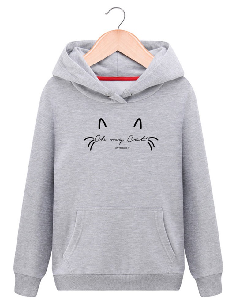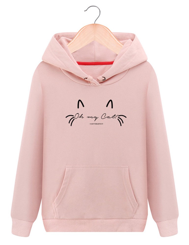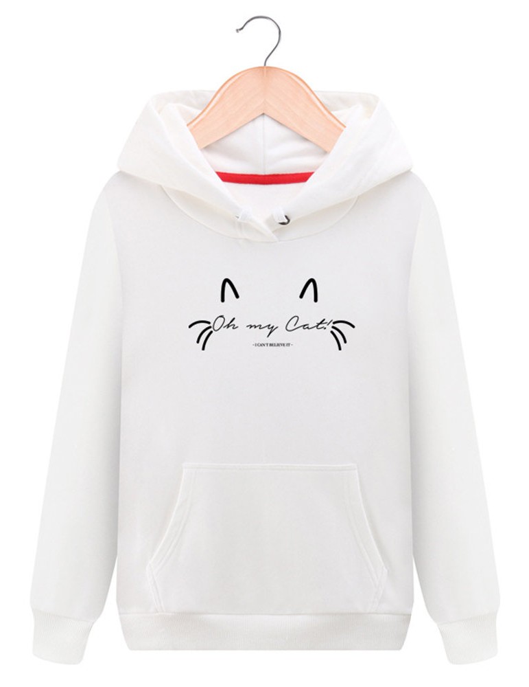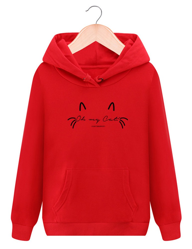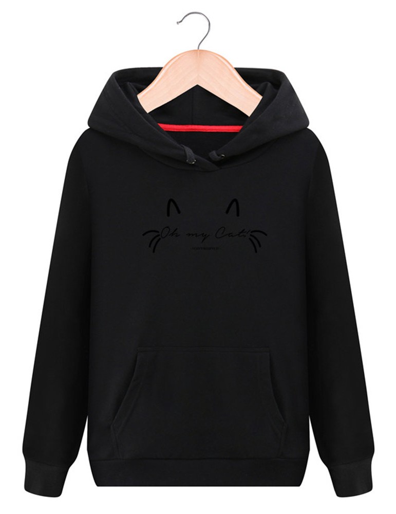 Women Cat Printed Hooded Long Sleeve Pocket Casual Sweatshirts