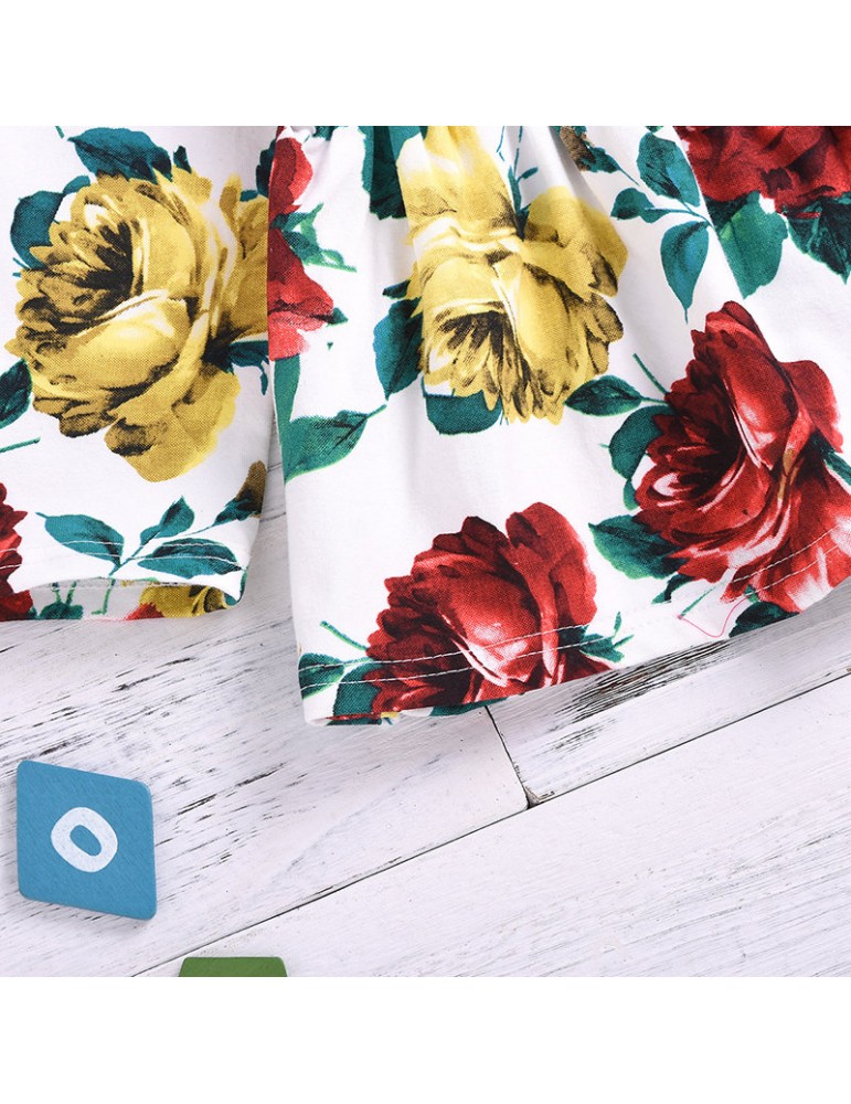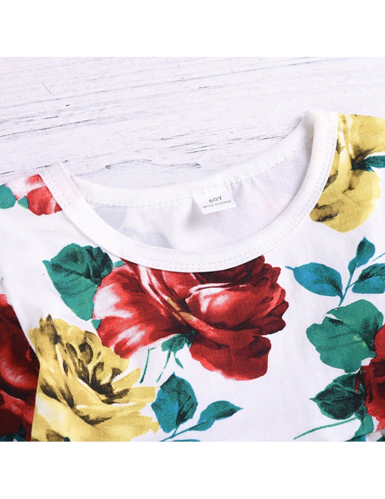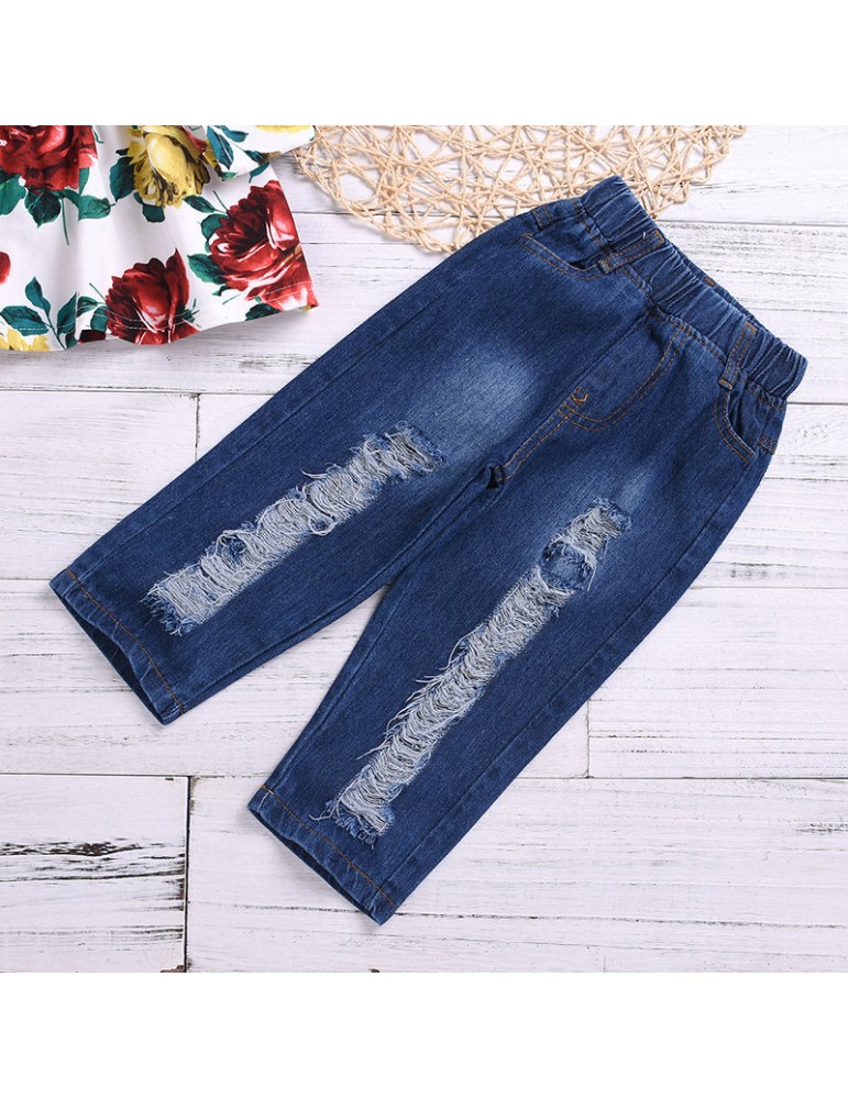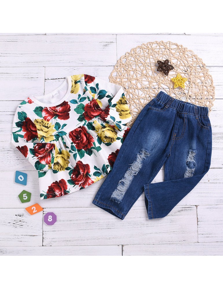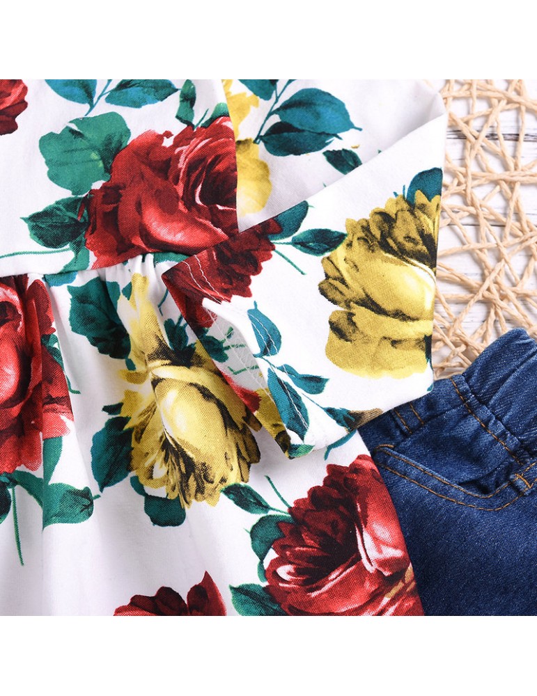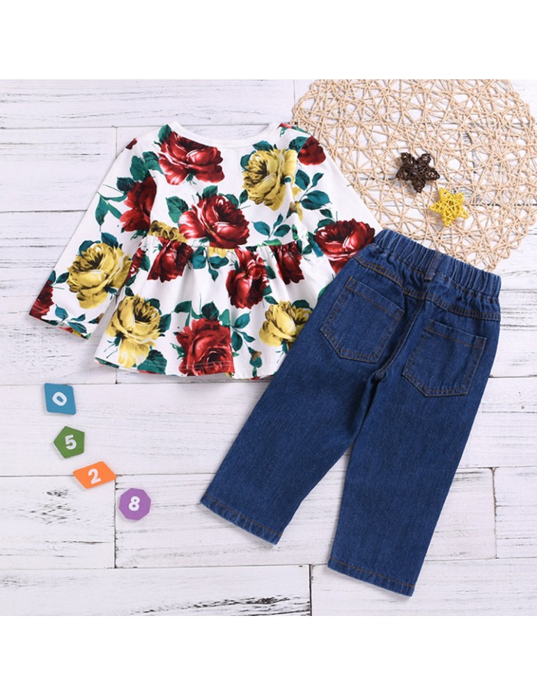 2Pcs Girls Set Flower Print Tops + Denim Pants For 1-7Years
