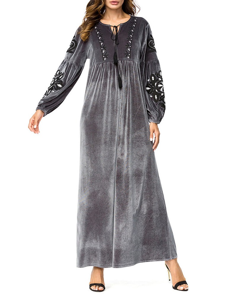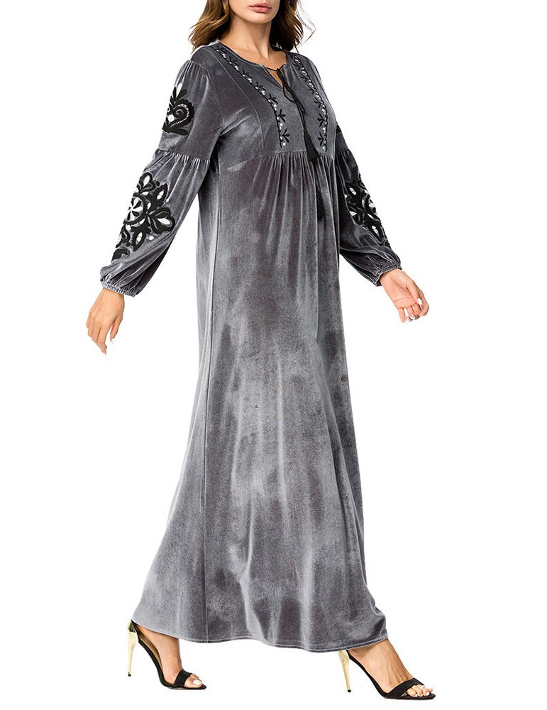 Muslim Embroidery Patchwork Maxi Velvet Dress