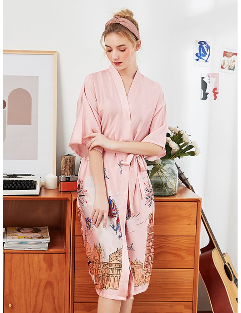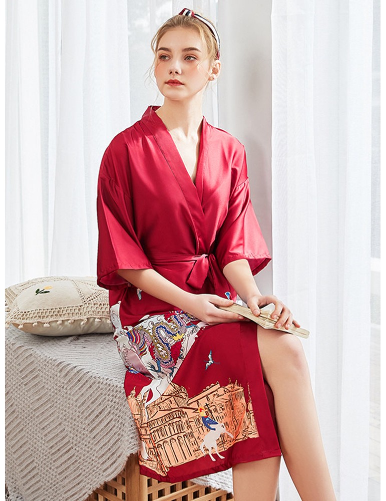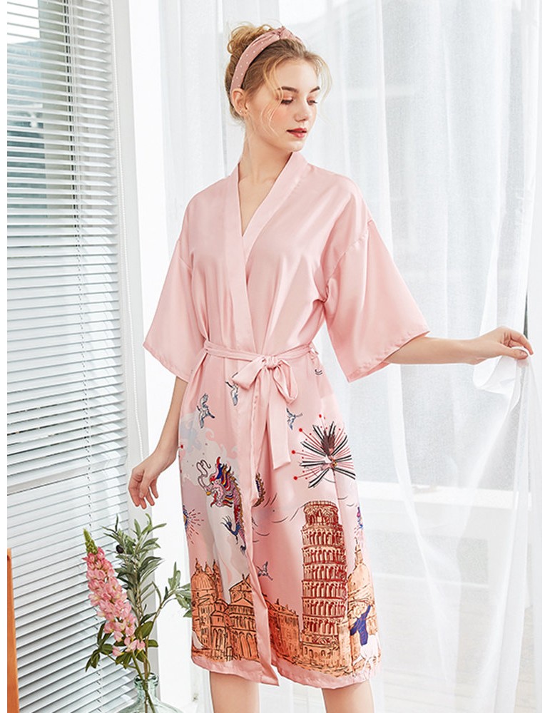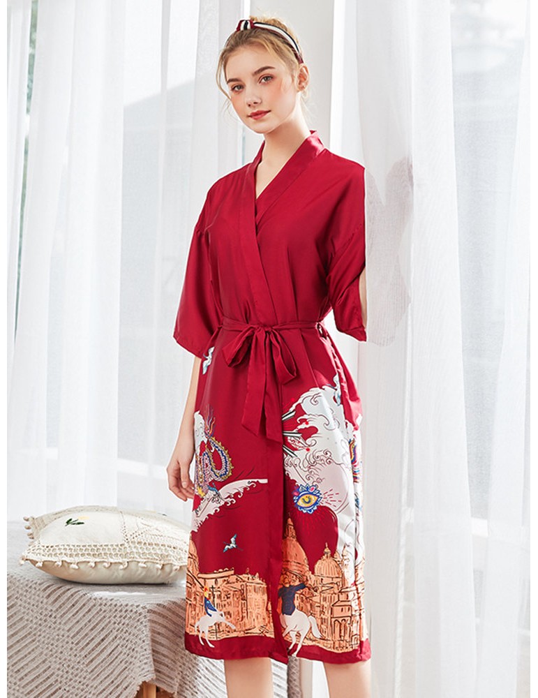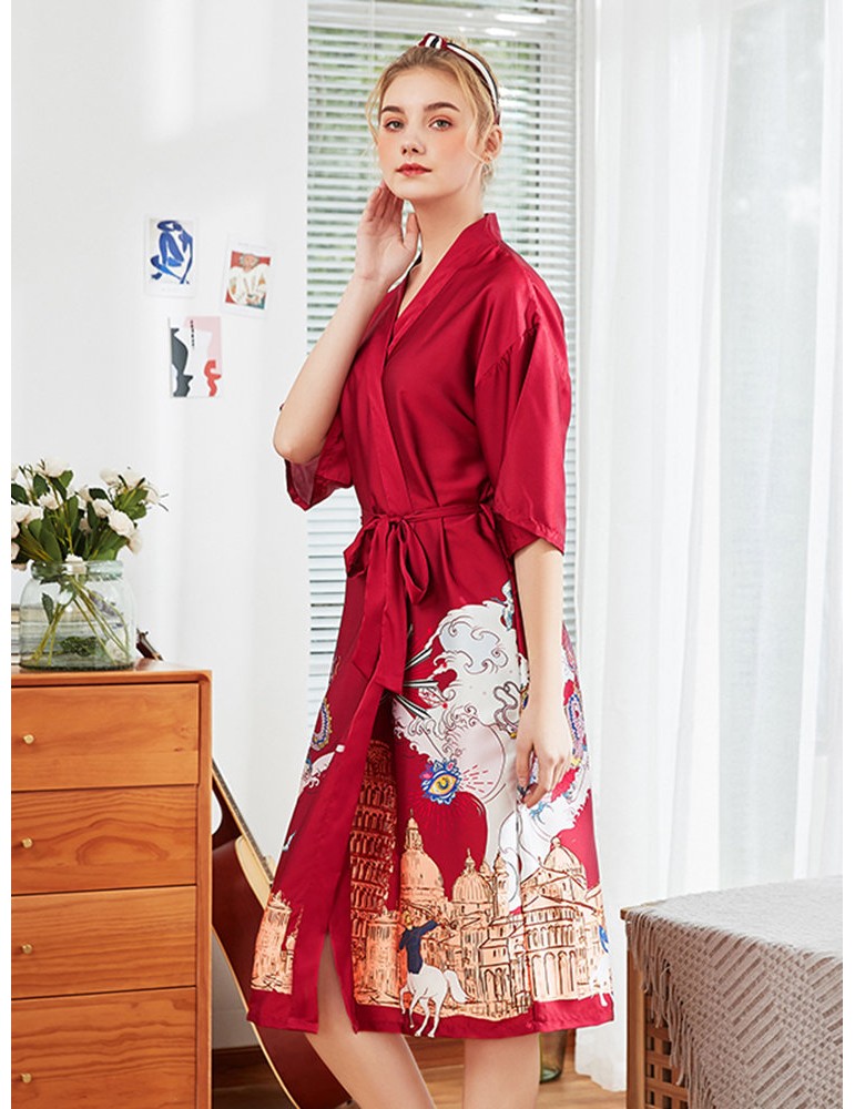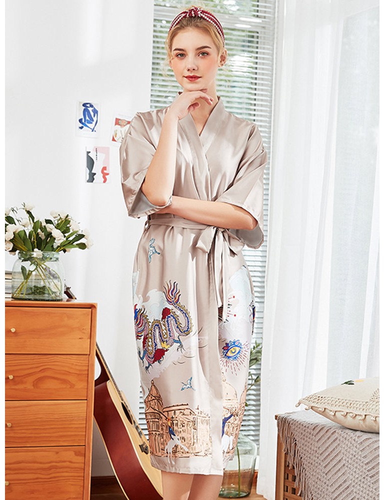 Plus Size Home Pajamas Animal Print Silk Mid-Calf Belt Loose Robe Sleepwear